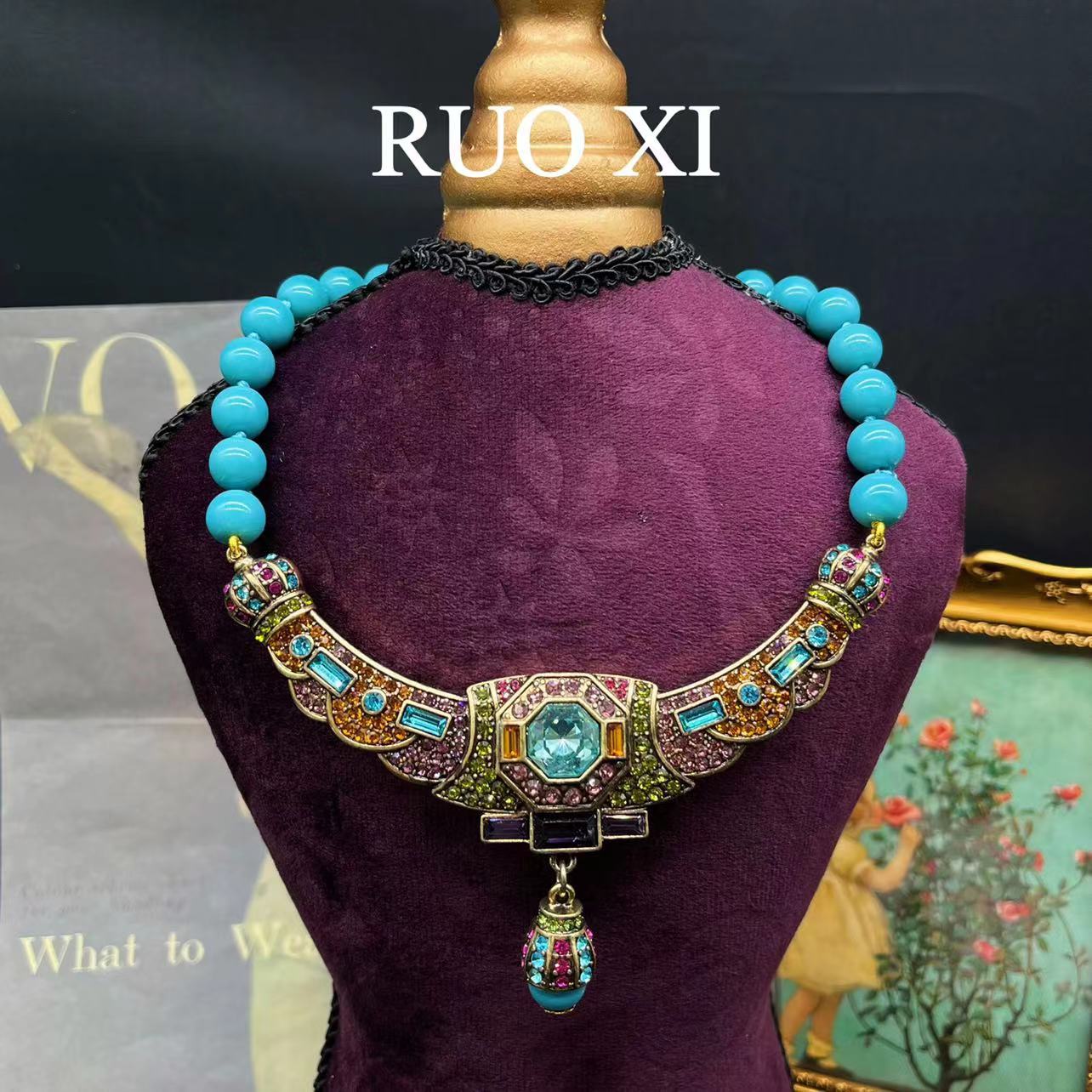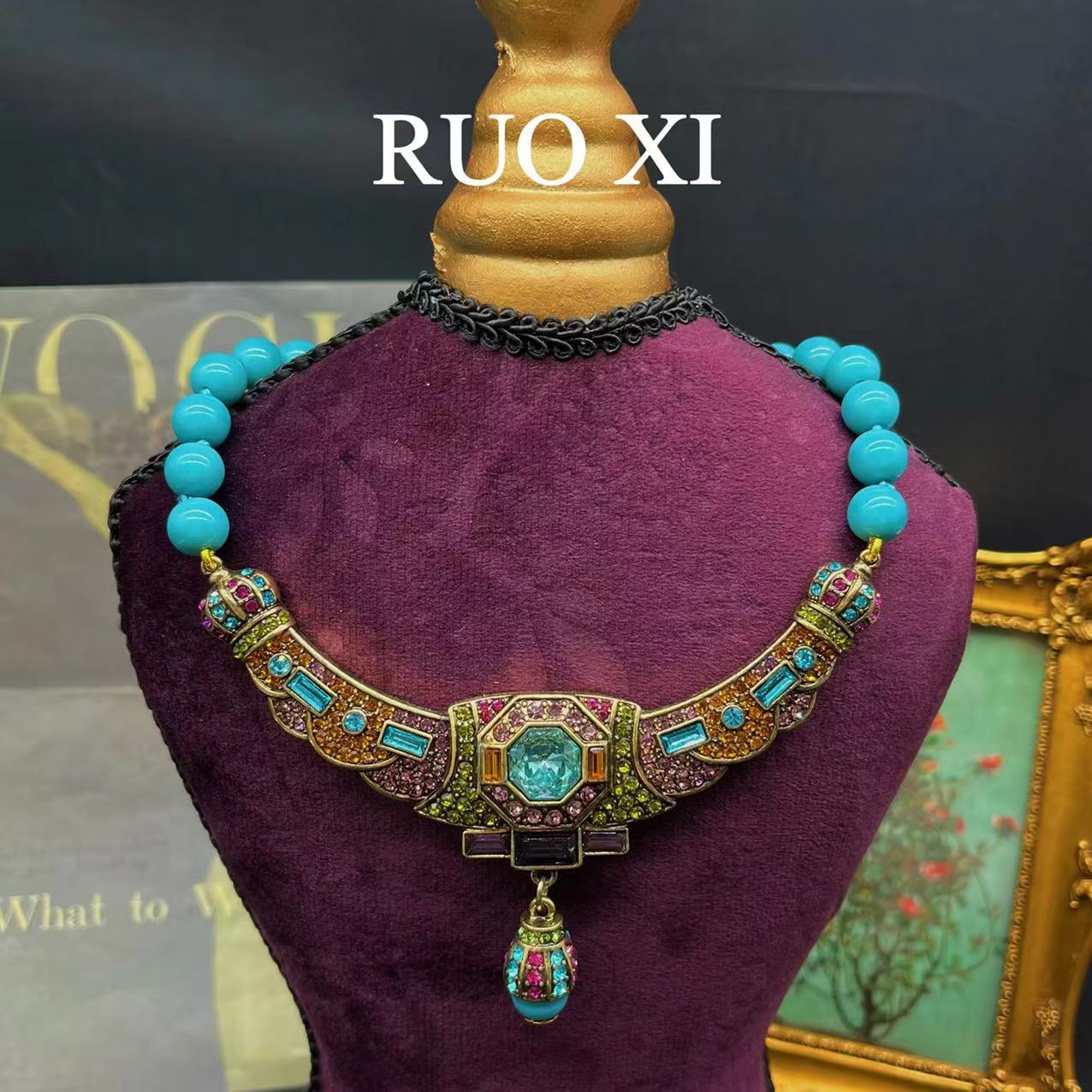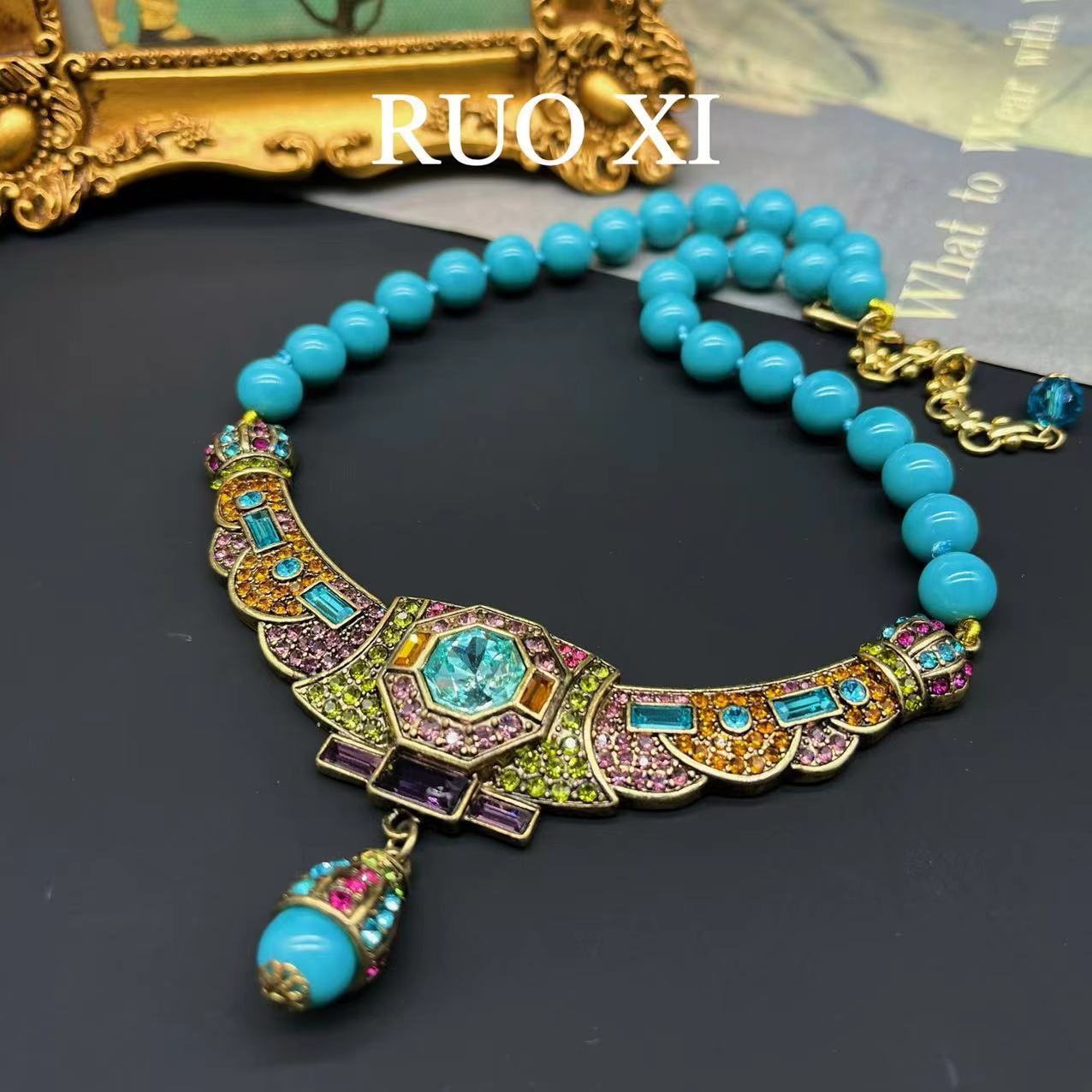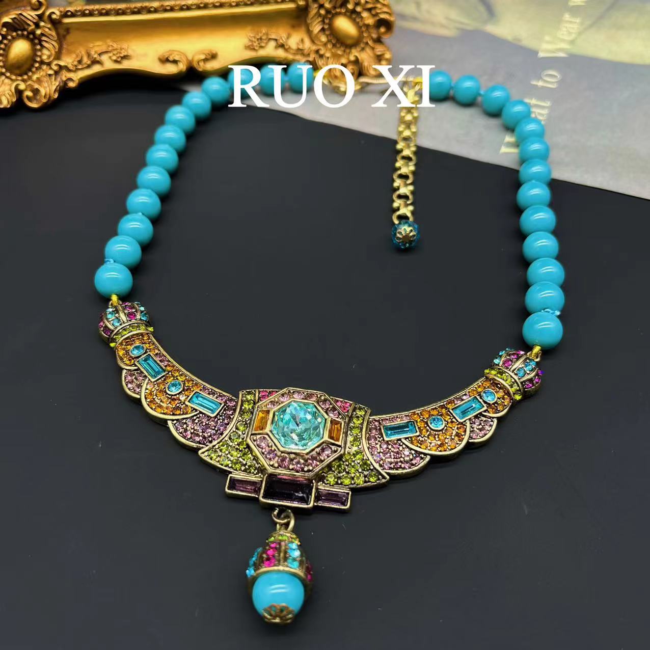 Qingdao Mediados de joyería antigua vintage europeo y americano rhinestone vintage collar azul turquesa piedra para montaña flash diamante