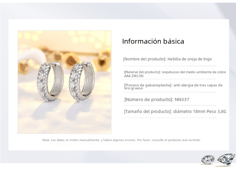 | Color | Hebilla de oreja de trigo (14K chapado en oro para la retención del color),Hebilla de oreja de trigo (retención de color plateado platino) |