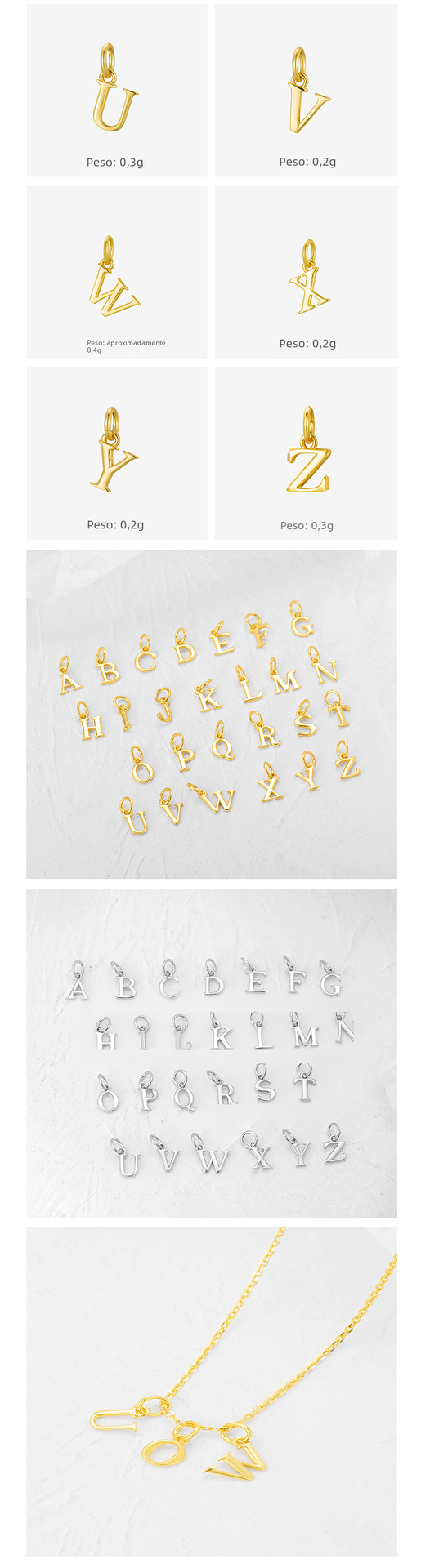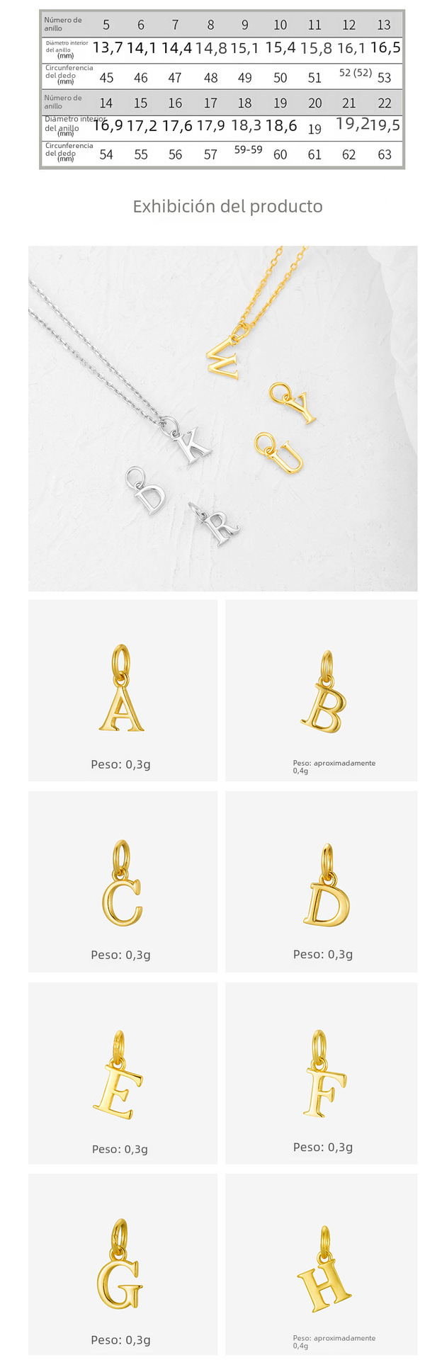 | Color | A,B,C,D,E,F,G,H,I,J,K,L,M,O,P,Q,R,S,T,U,V,W,X,Y,Z,1,2 cadena cruzada cadena desnuda (sin colgante),Cadena desnuda móvil (sin colgante),26 letras (colgante) |