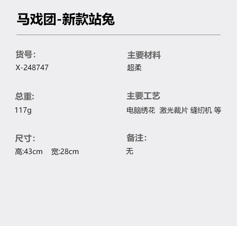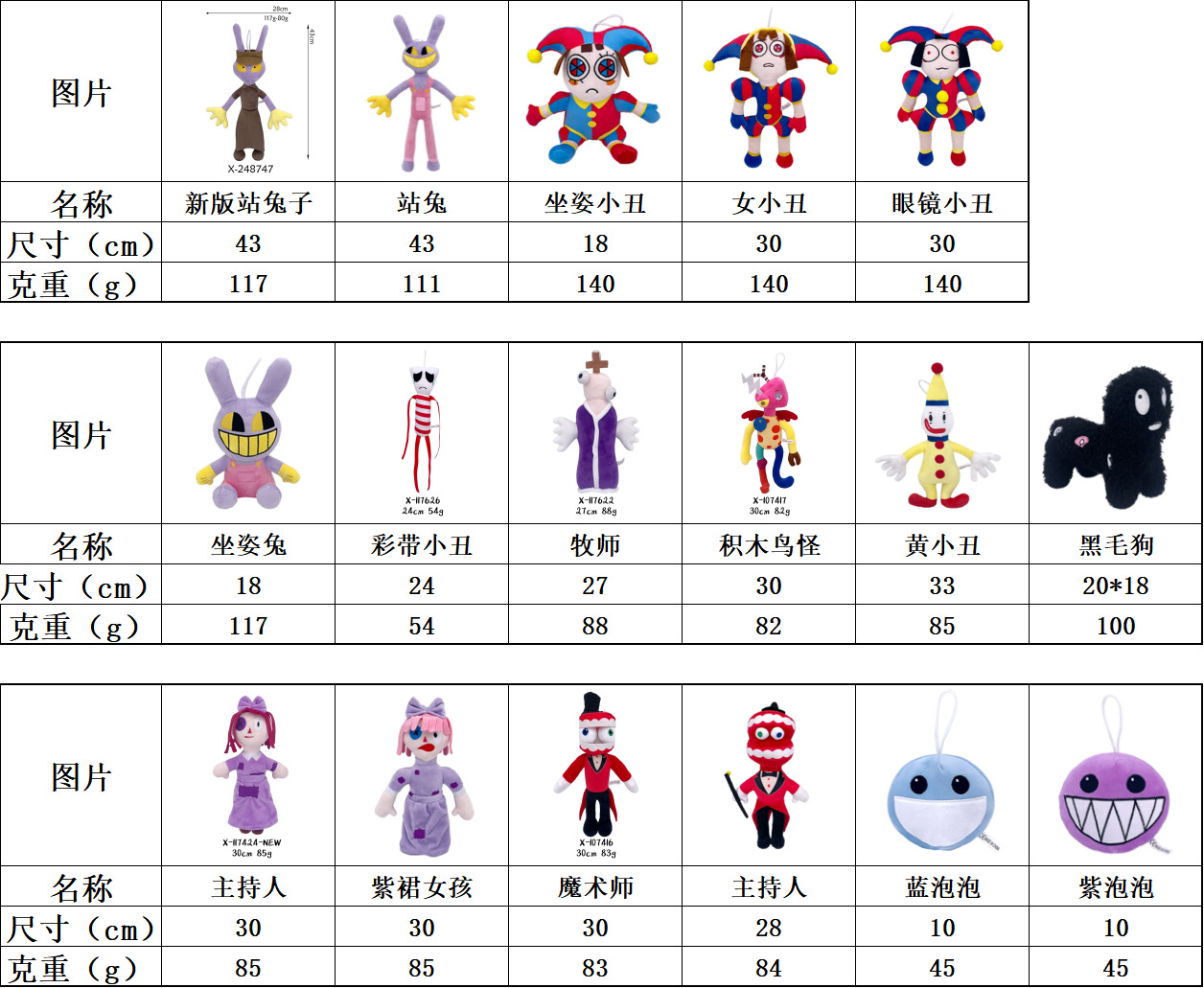 | Colores | Esqueleto blanco,Conejo de estación con capucha,Cabeza estéreo Caine,Casquillo no tejido Caine,Pomni,Kaufmo,Ragatha Pelo Púrpura,Ragatha Pelo en polvo,Jax,Kinger,Zooble,Bubble Azul,Negro gafas payaso,Siéntate feo,Variación Kaufmo,Bubble púrpura-agotado descatalogado-personalizado, comuníquese con el servicio al cliente,Conejo sentado: agotado y descontinuado. Para pedidos personalizados, comuníquese con el servicio de atención al cliente. |