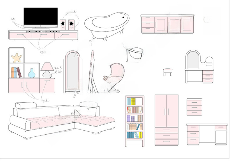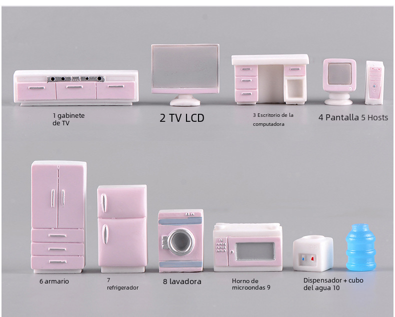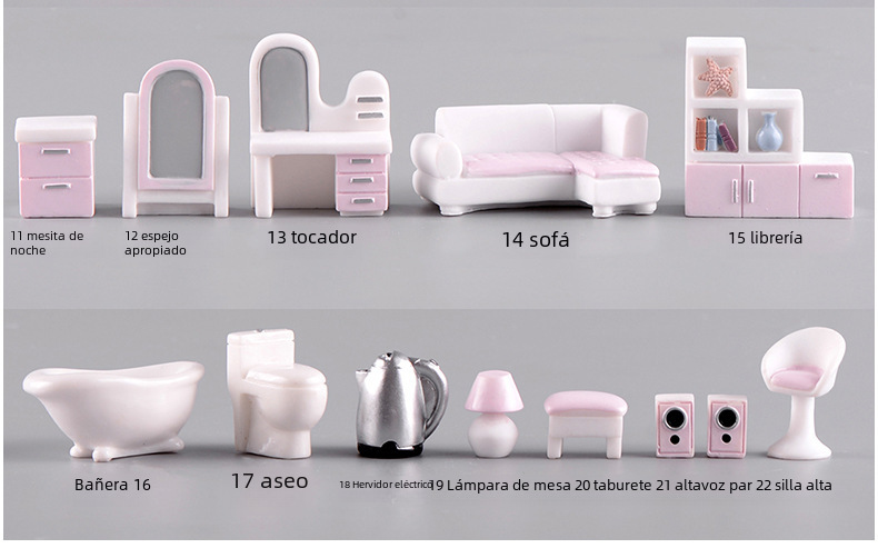 | Color | 1 gabinete de TV,2 TV LCD,3 Escritorio de ordenador,4 Pantalla,5 Hosts,6 armario,Refrigerador 7,8 Lavadoras,9 horno microondas,10 dispensador de agua + barril,11 mesita de noche,12 espejo apropiado,13 tocador,14 sofá,15 librería,16 bañera,17 aseo,18 Hervidor eléctrico,19 lámpara de mesa,20 taburetes,21 par de altavoces,22 silla alta |