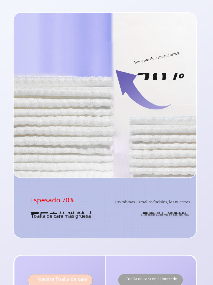 • Espesor adicional:La toalla tiene un espesor adicional, lo que la hace más duradera y más efectiva para limpiar el maquillaje y limpiar la piel.