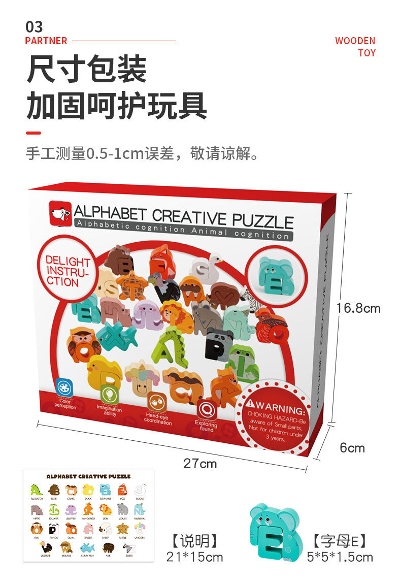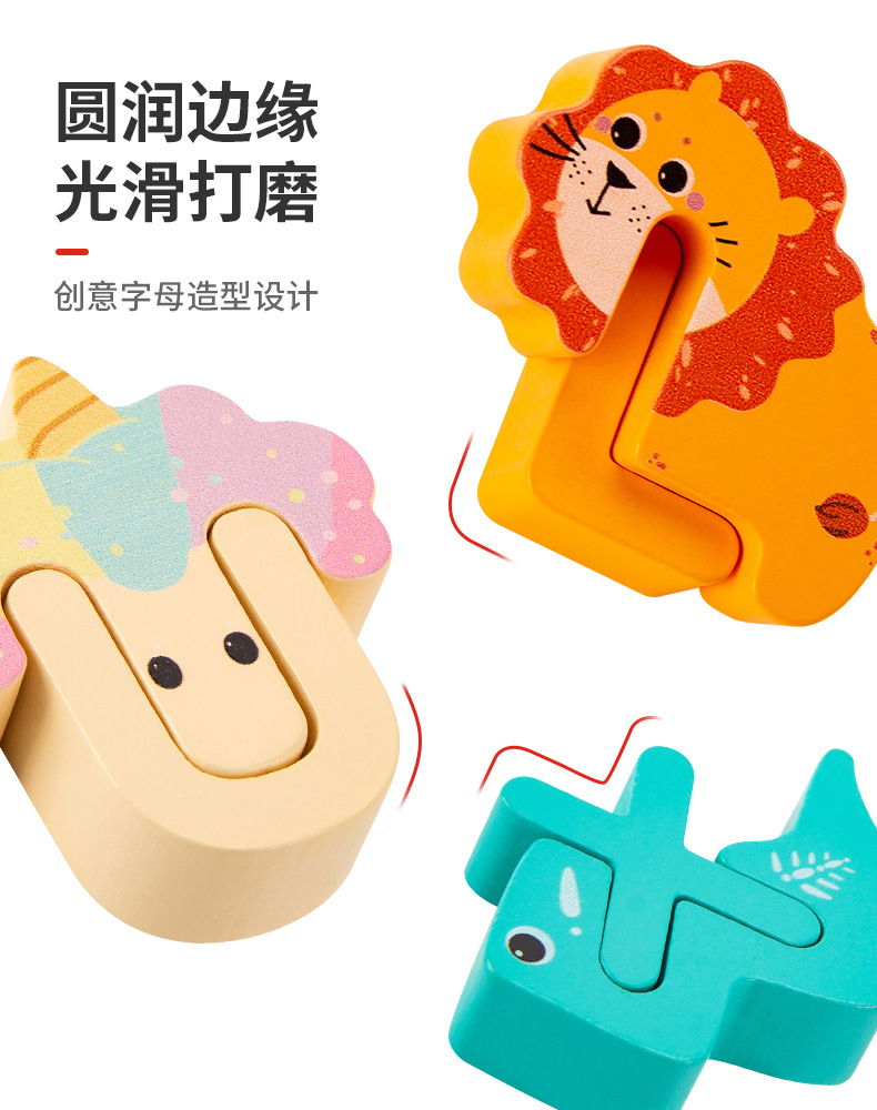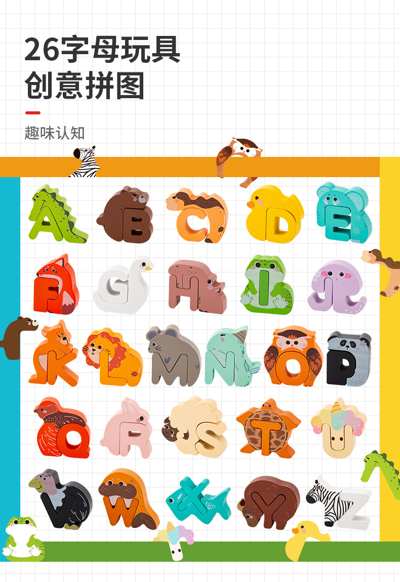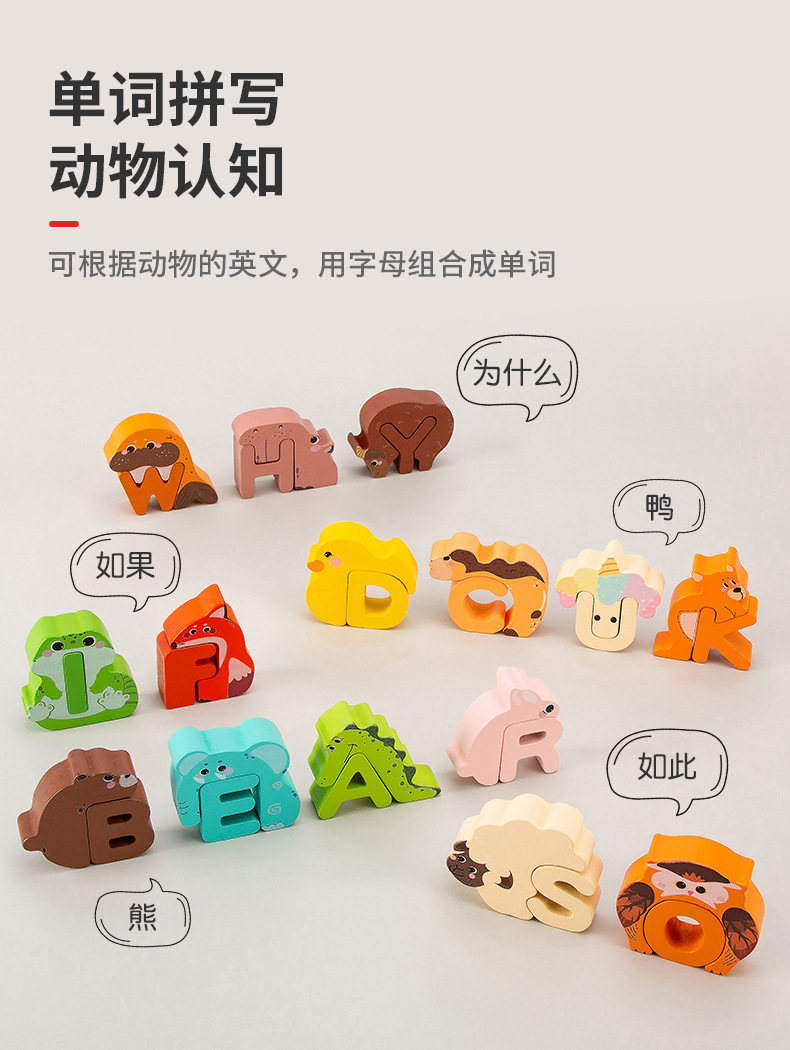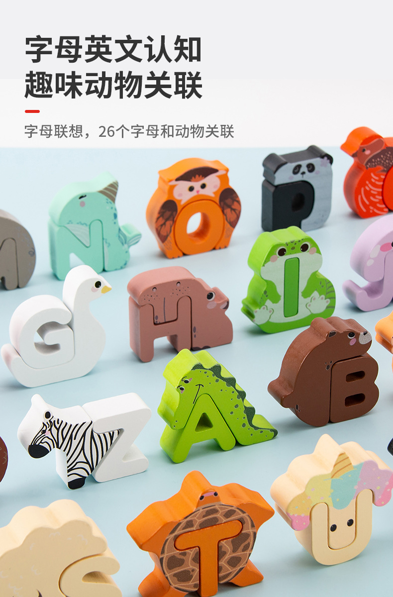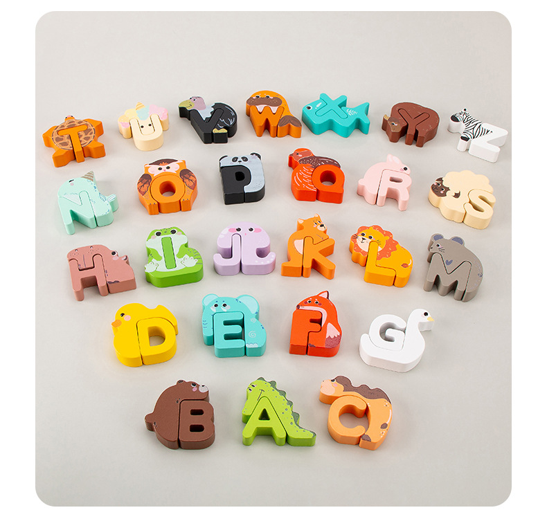 Animal de dibujos animados transfronterizos para niños creativo 26 letras inglesas palabras cognitivas educación temprana rompecabezas juguetes de madera