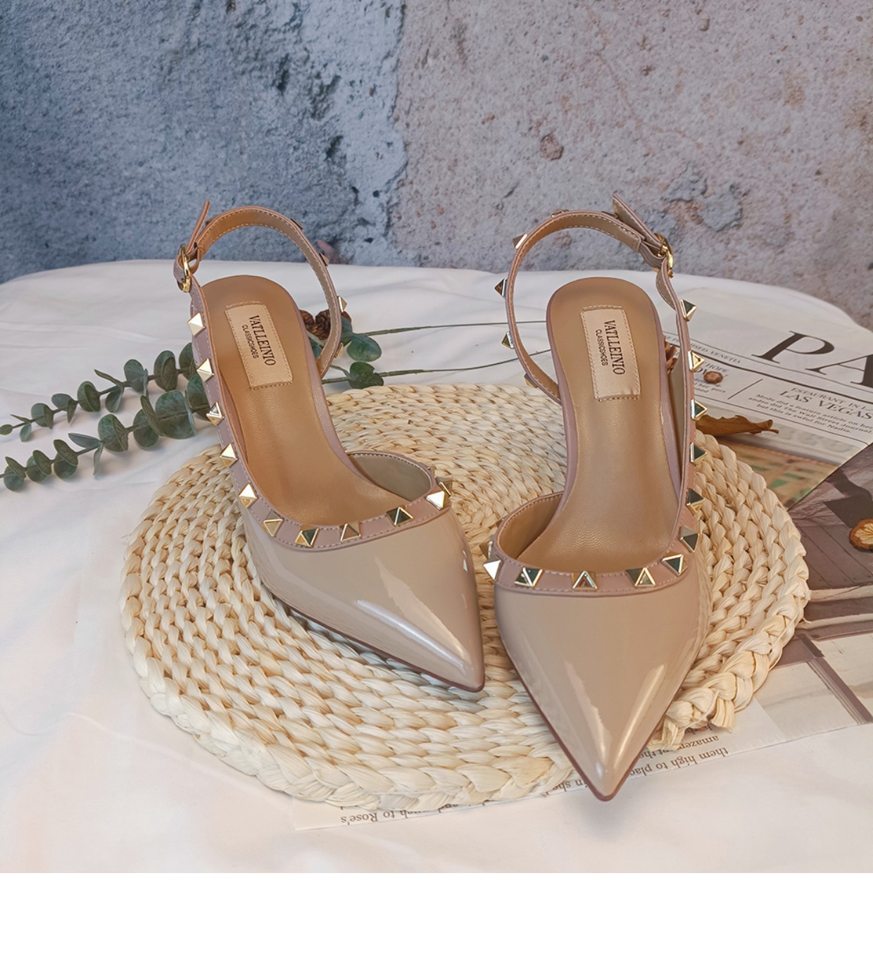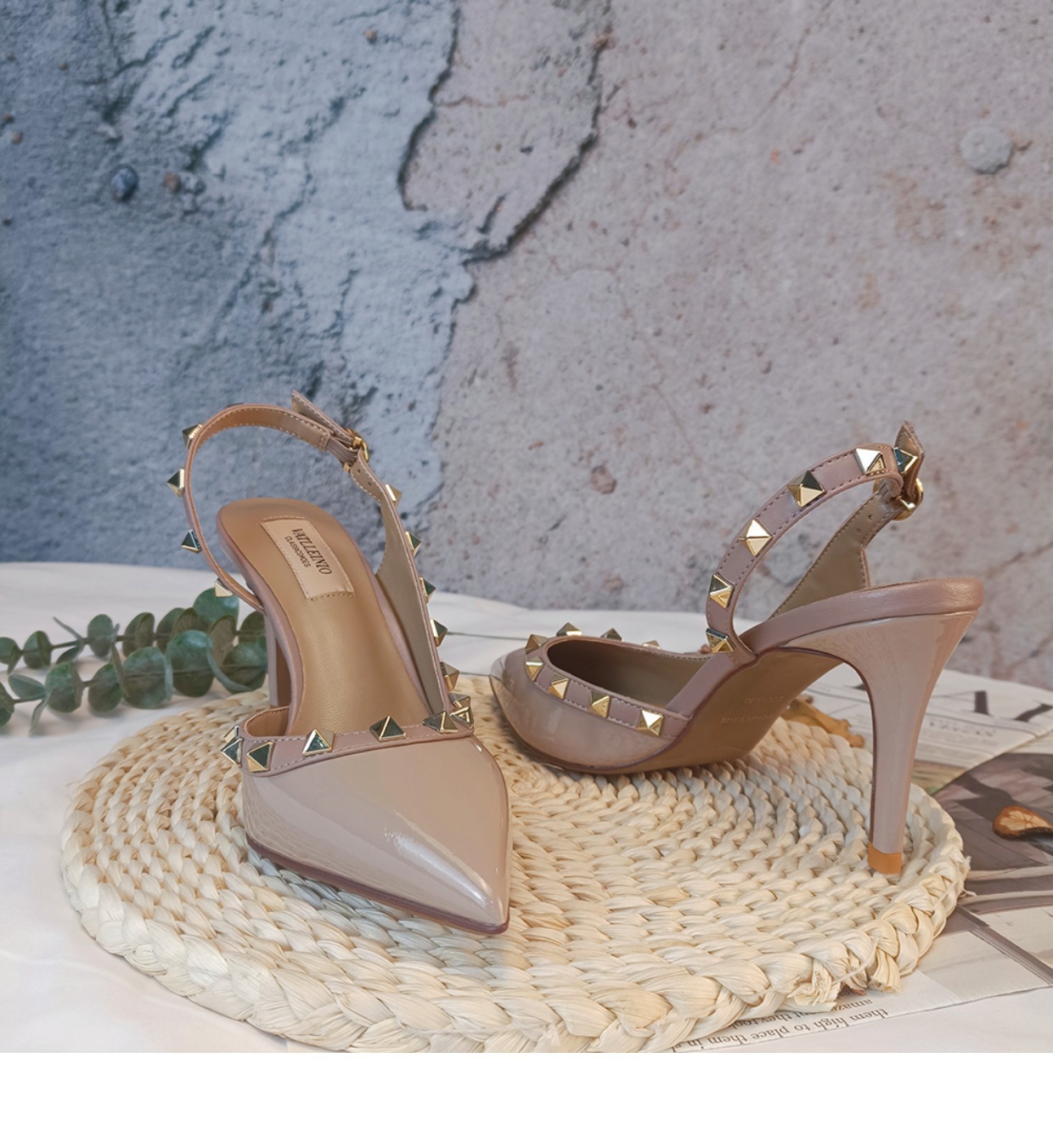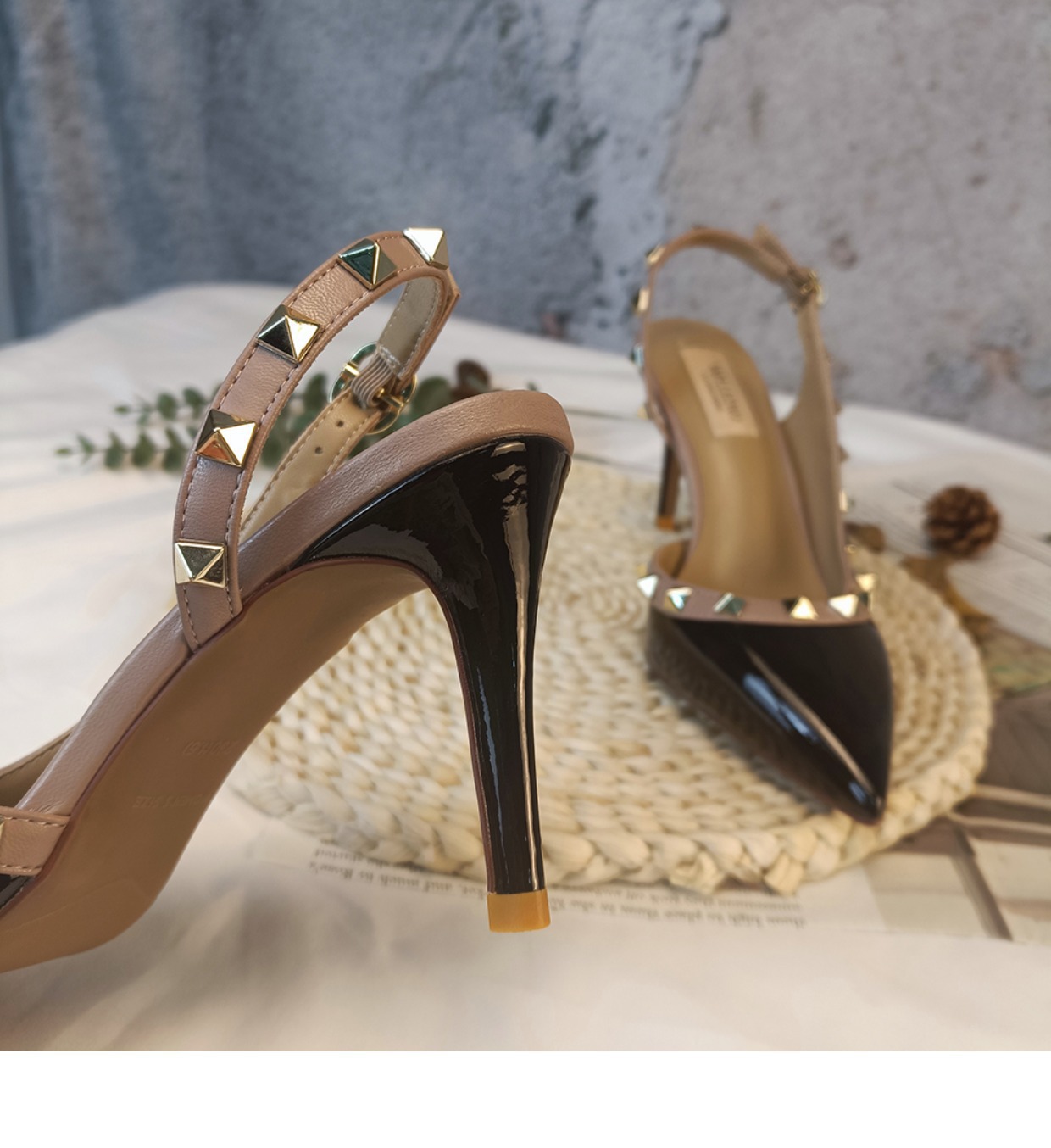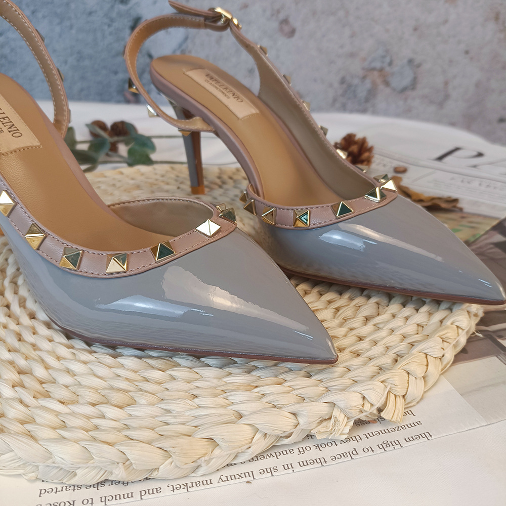 Nuevos tacones altos con remaches puntiagudos desnudos en primavera y verano 2023 tacones finos V liuding zapatos vacíos en el lado de la sandalias Baotou mujeres