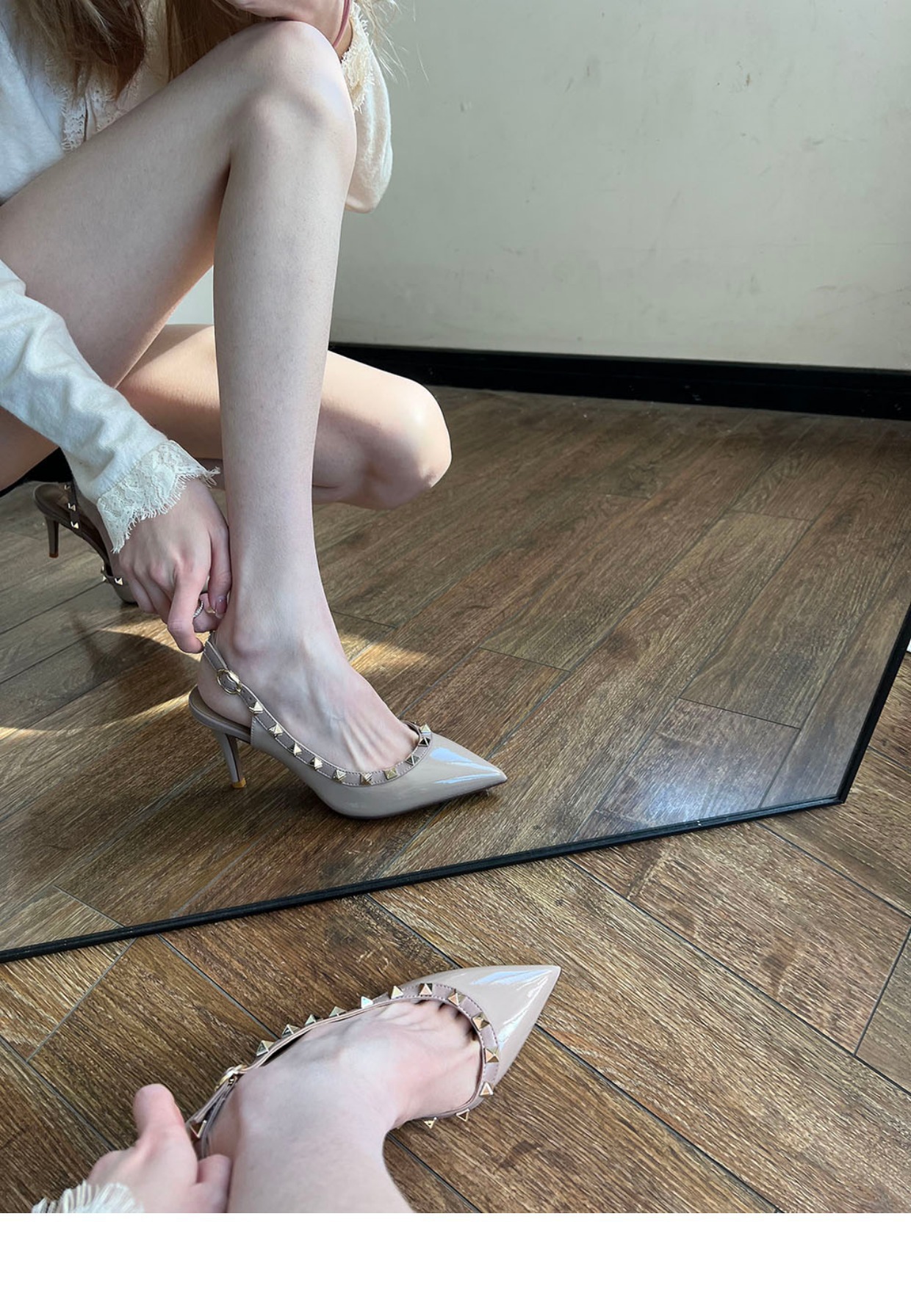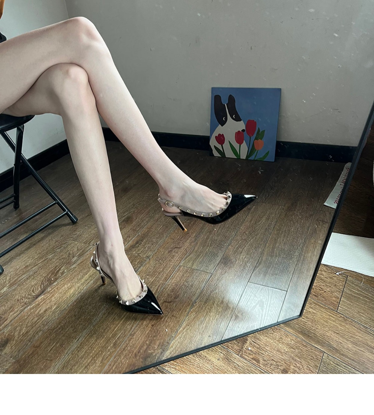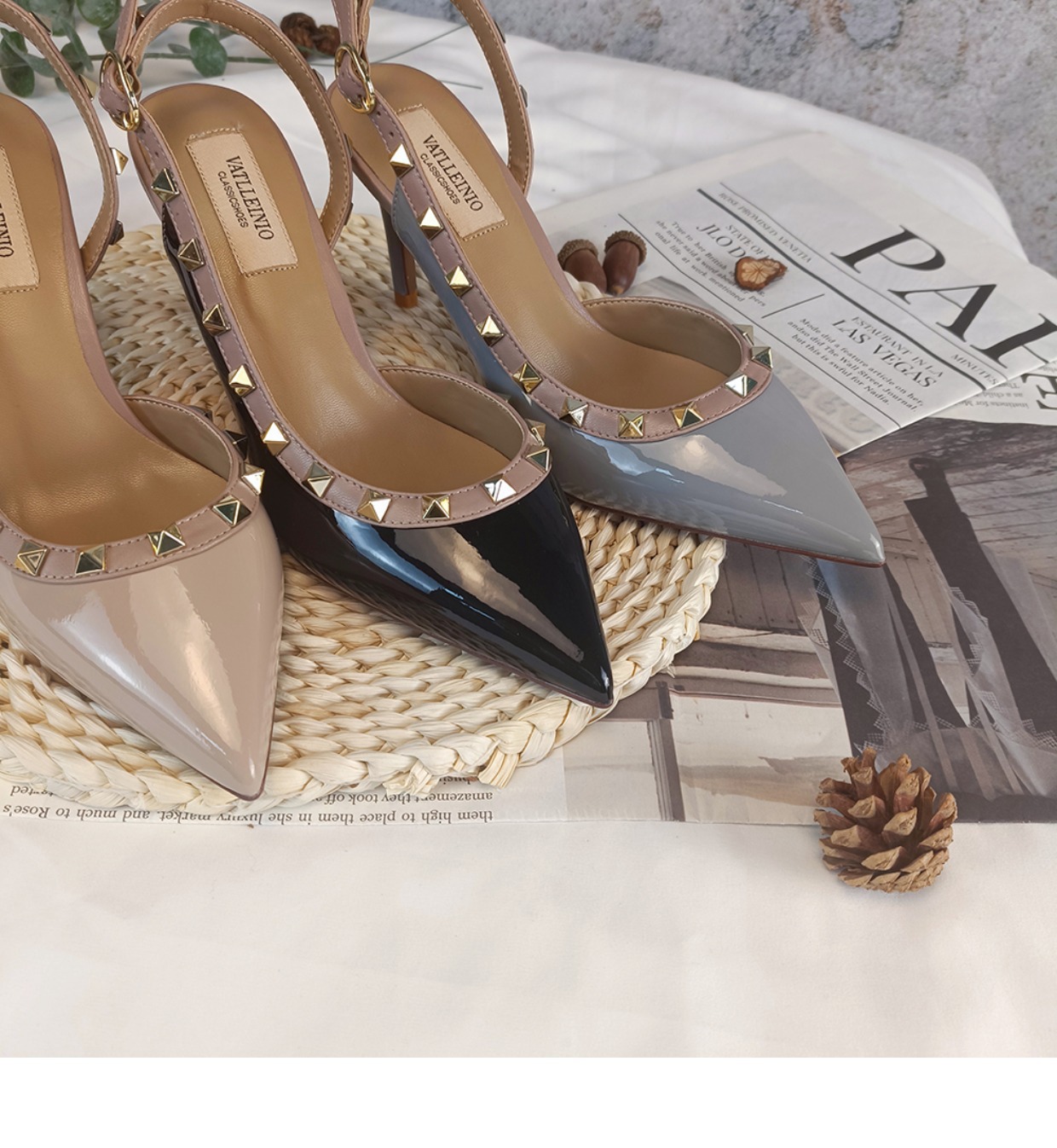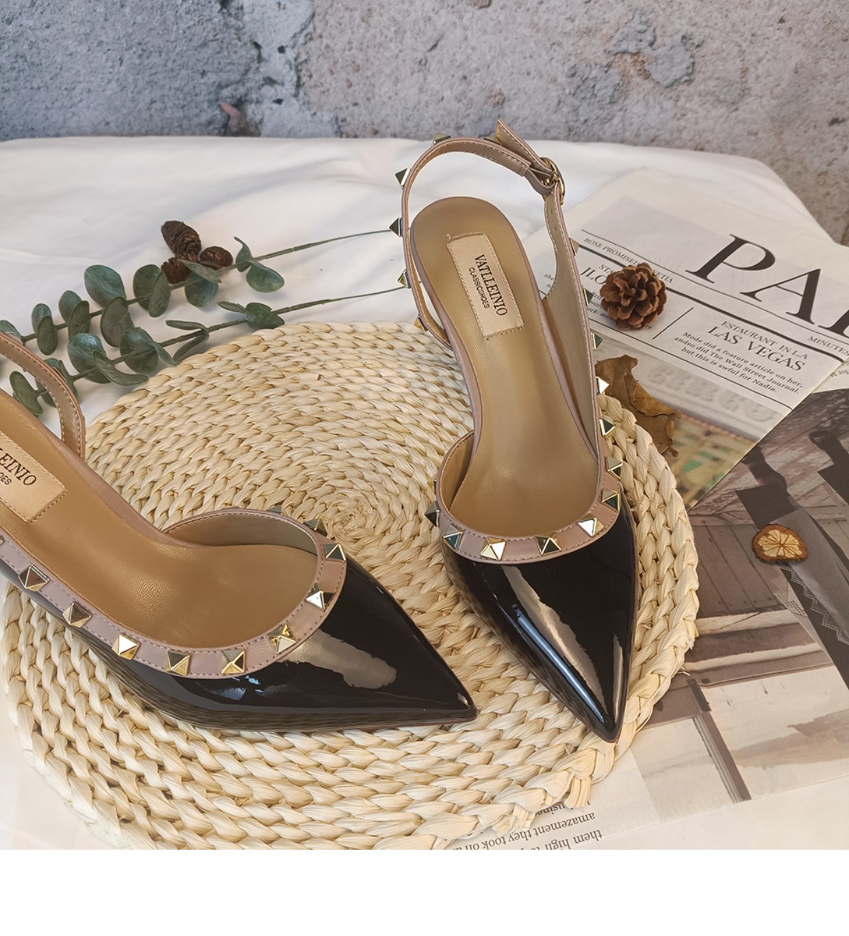 Nuevos tacones altos con remaches puntiagudos desnudos en primavera y verano 2023 tacones finos V liuding zapatos vacíos en el lado de la sandalias Baotou mujeres