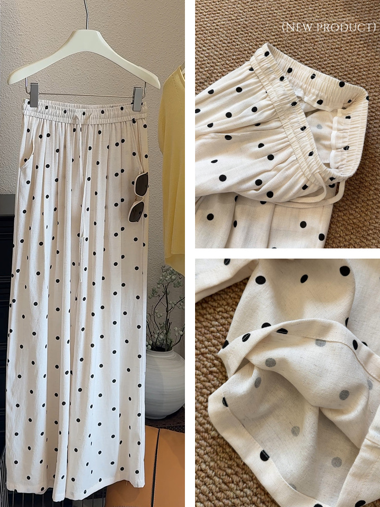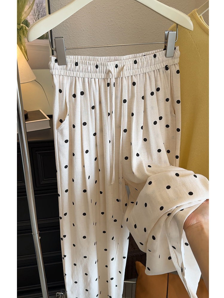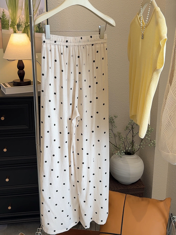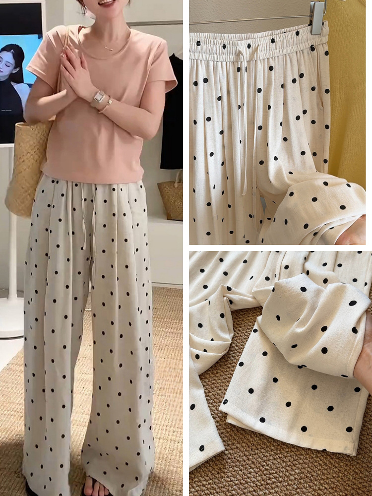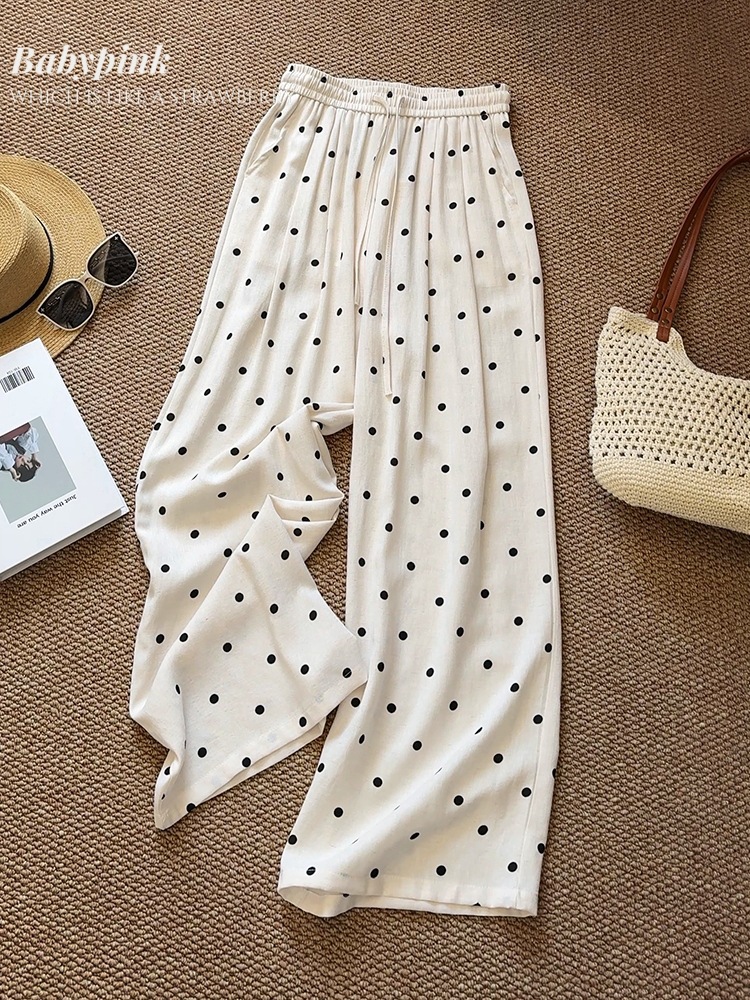 Muy colgante y suave ~ Pantalones de lunares de cintura elástica pantalones casuales de pierna ancha pantalones de lino de algodón color albaricoque 2025 pantalones frescos de verano
