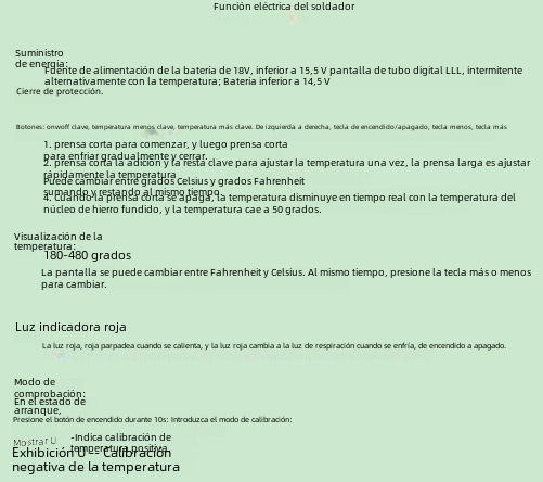 | Temperatura | 180 grados-480 grados Celsius y Fahrenheit conmutable |