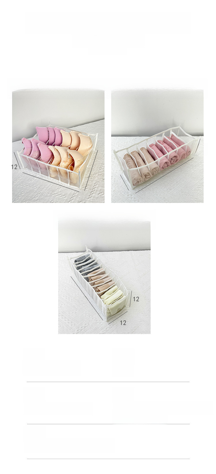 | Tamaño | Pequeño 7 rejilla-ropa interior (32*12*12),Pequeño 6 rejillas-Sujetador (32*32*12),Pequeño 11 rejilla-Calcetines (32*12*12),Medianos 7 rejilla-polainas (36*17*12),Big 7 rejilla-Jeans (36*25*20),Camisa grande de la camiseta 9-Grid (36*25*20),Set de 3 piezas (7 + 6 + 11),Portátil grande 7 rejillas (36*25*20),Portátil grande 9 rejillas (36*25*20) |
