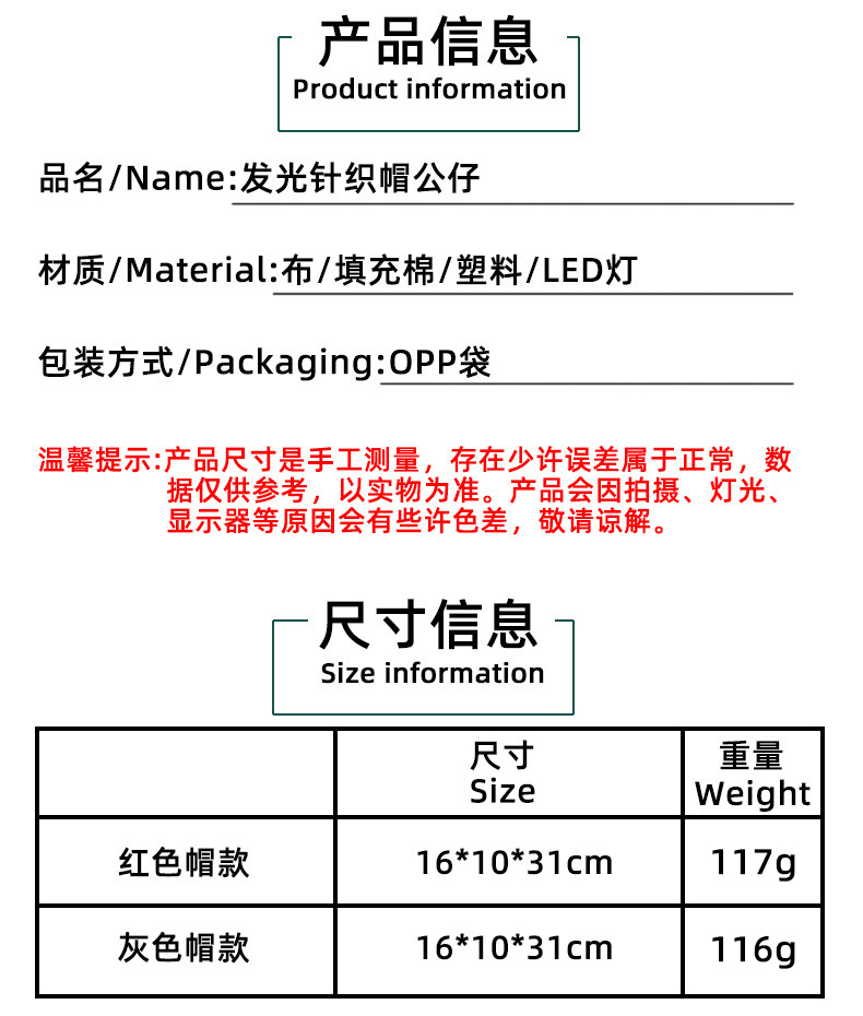 | Artículo No. | Muñeca luminosa con sombrero de Punto ligero |