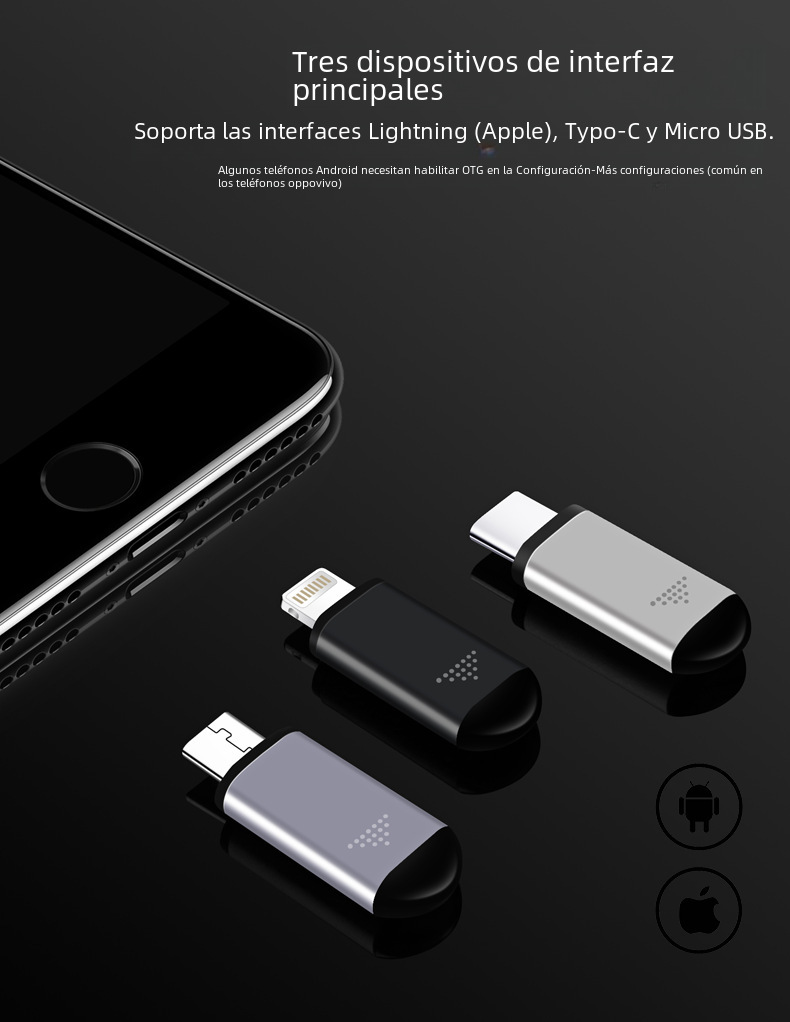 | Teléfono compatible | Apple 5 o más Android admite OTG |