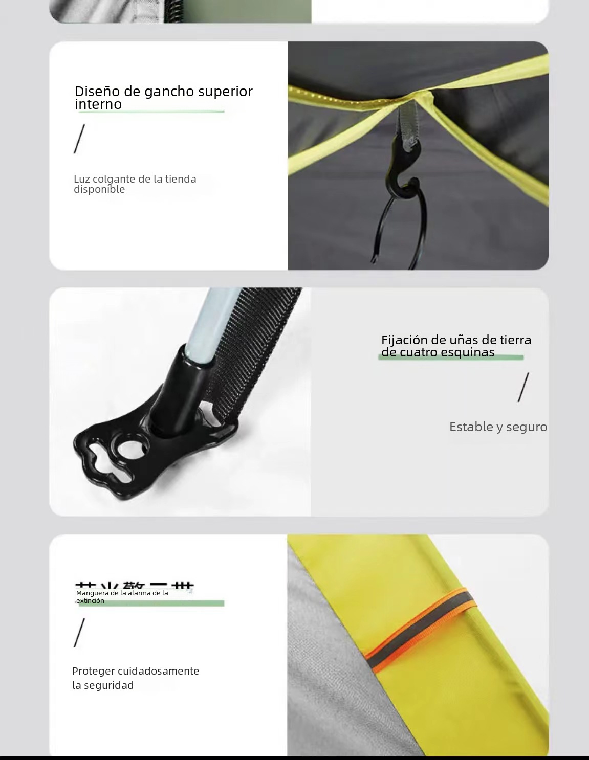 | Número aplicable | 3-4 personas (una sola tienda),3-4 personas (tienda + estera a prueba de humedad),5-8 personas (tienda individual),5-8 personas (tienda + estera a prueba de humedad) |