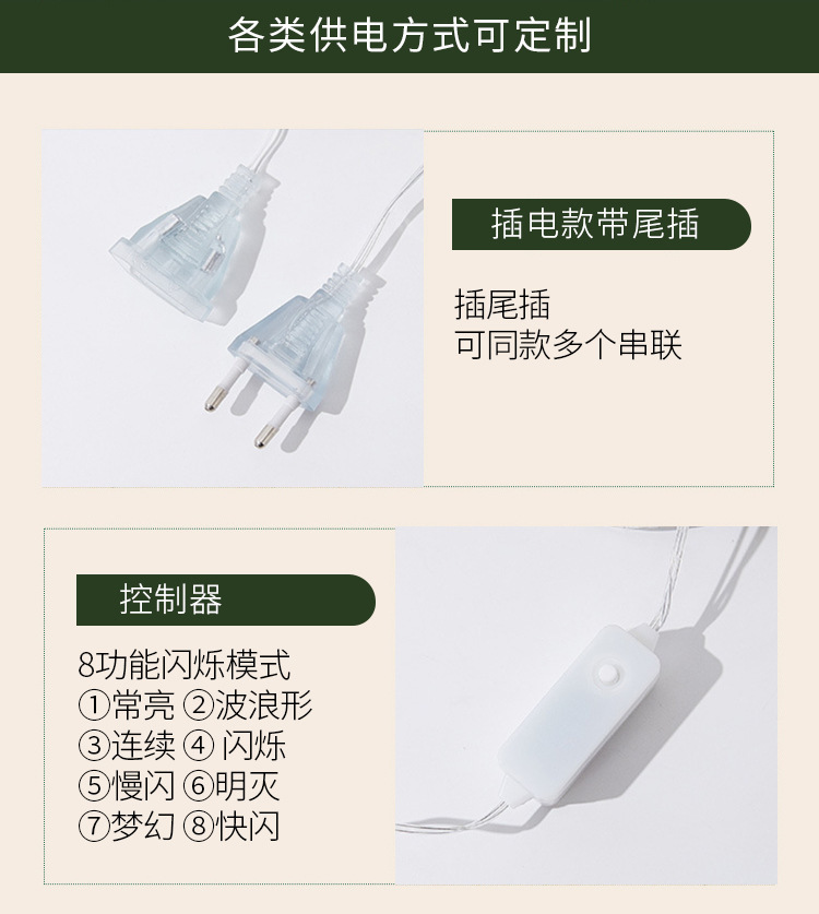 | Color de luz | La Luna blanca caliente que sostiene el enchufe de la estrella se puede conectar en serie,Estrellas blancas calientes se pueden conectar en serie,El plug-in de ciervo blanco cálido se puede conectar en serie,El plug-in de árbol de Navidad blanco cálido se puede conectar en serie,Caliente nieve blanco flor enchufe eléctrico se puede conectar en serie,La electricidad enchufable mezclada blanca caliente se puede conectar en serie,Luna colorida celebración estrella plug-in se puede conectar en serie,Las estrellas de color se pueden conectar en serie,Color Deer plug-in se puede conectar en serie,El plug-in colorido del árbol de Navidad se puede conectar en serie,Copo de nieve colorido plug-in se puede conectar en serie,El poder enchufable mezclado del color se puede conectar en serie |