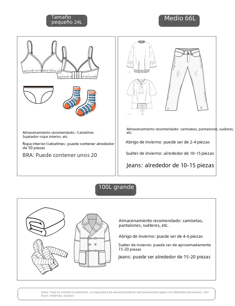 | Tamaño | 24L(40*30*20)2 Soporte,66L(50*40*33)3 Soporte,100L(60*42*40)4 soporte,110L(60*45*40) |