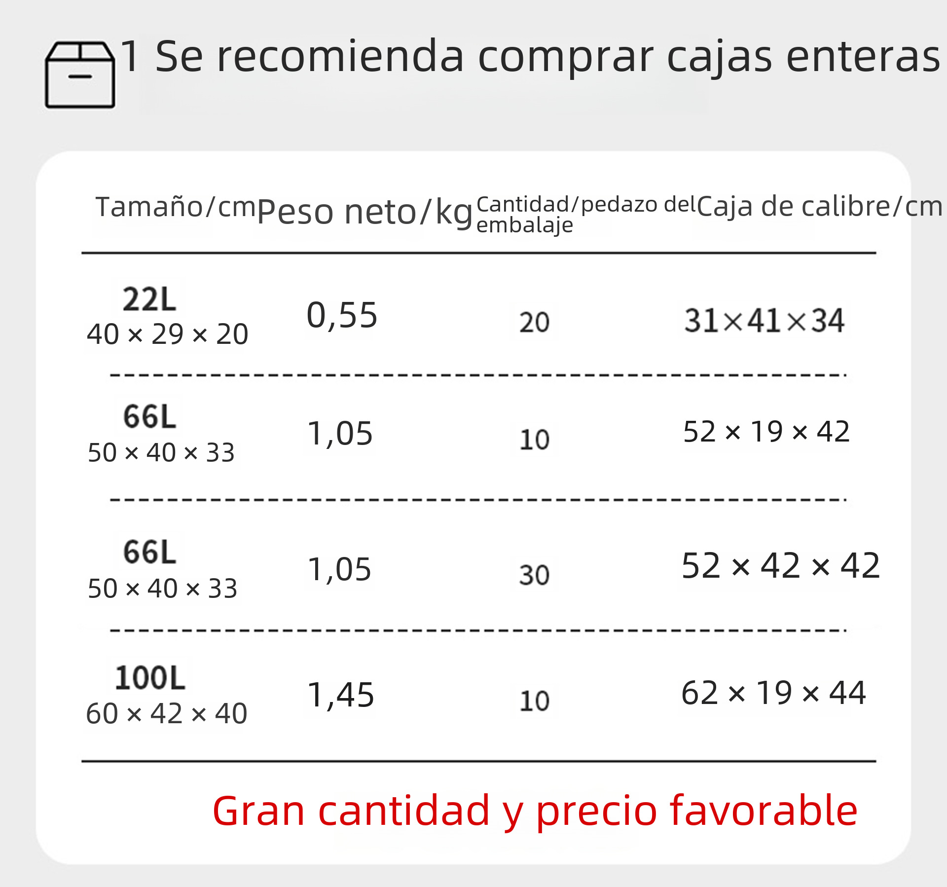 | Tamaño | 22L(40*29*20CM),66L [50*40*33cm],100L [60*42*40cm] |