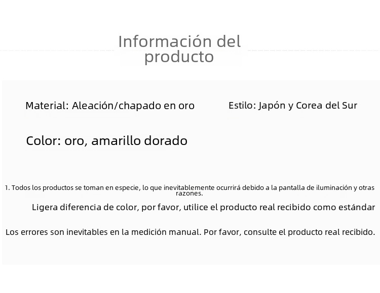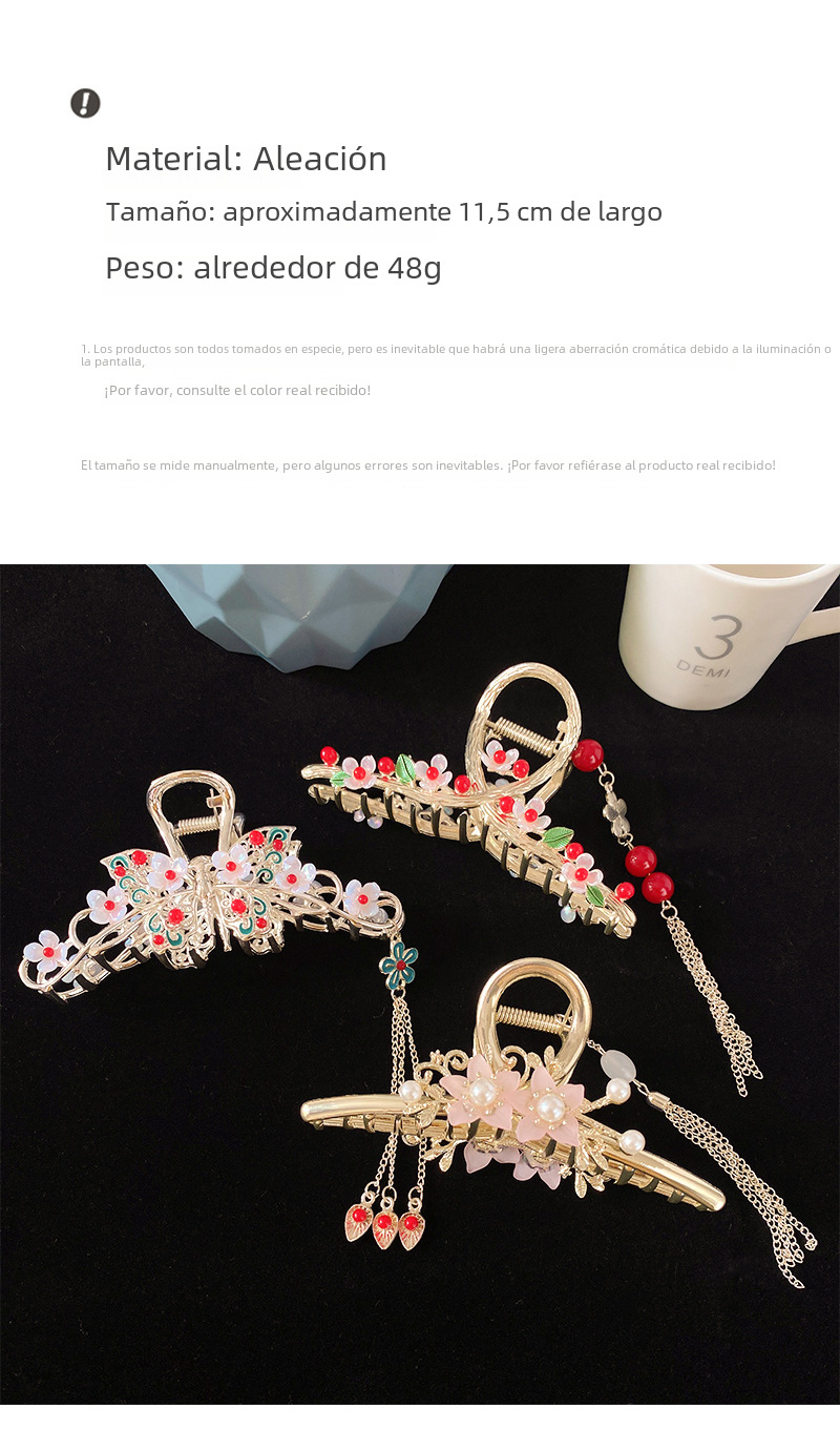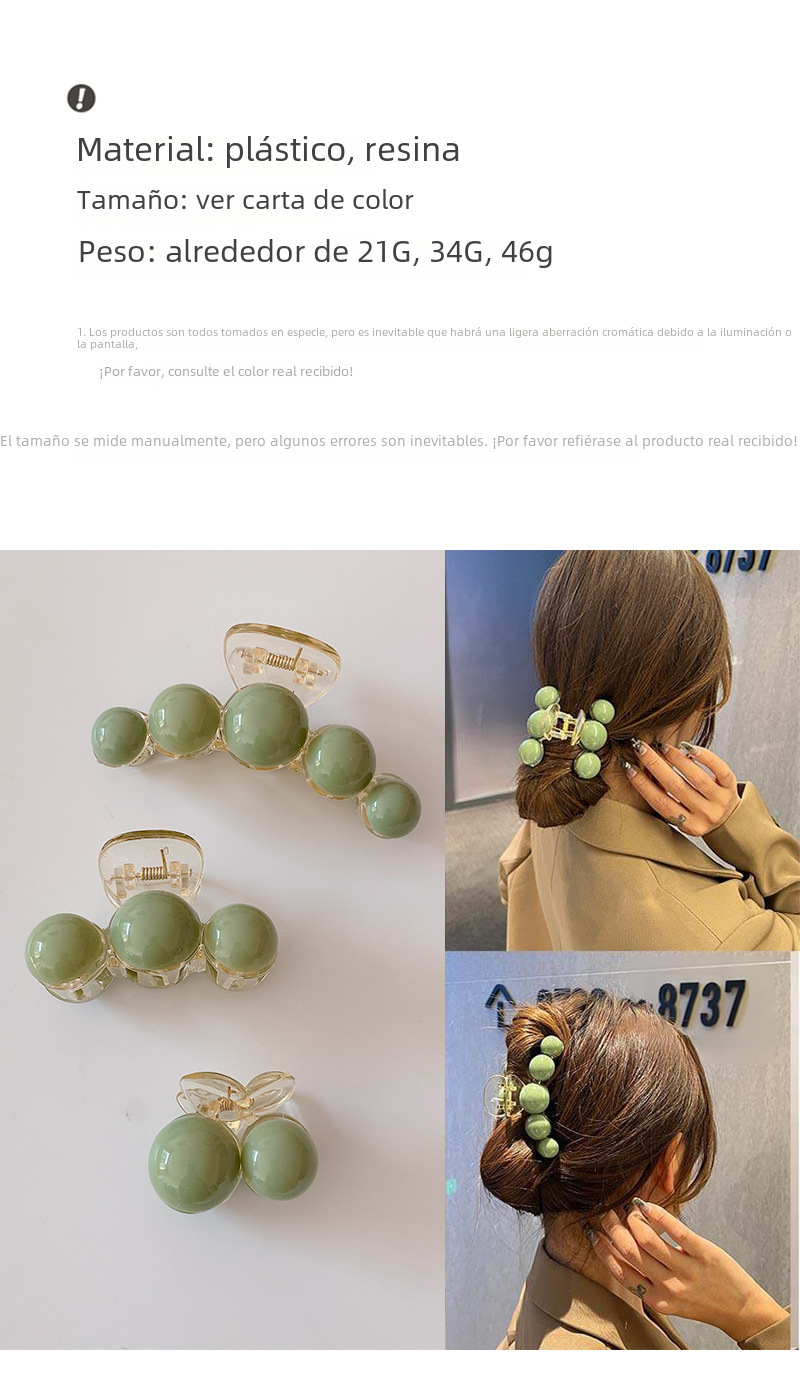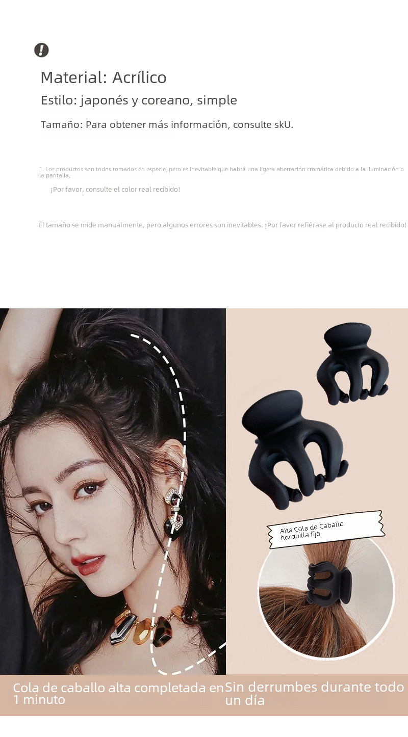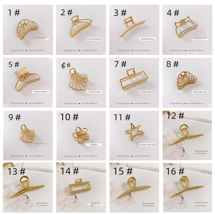 | Colores | Rectángulo mediano (oro mate),Simple mediano (oro tonto),Arco mediano (oro mate),Gato mediano (oro tonto),Triángulo mediano,Concha mediana en forma de abanico [recomendado por el comerciante] (oro mate),Arco grande,Rectángulo grande,Clip plateado brillante tipo gancho,Clip de agarre negro de pistola tipo gancho,Clip plateado tipo M,Clip dorado tipo M,Pinza de agarre flocado de tulipán,5 cuentas de smog verde,3 cuentas de smog verde,2 cuentas de smog verde,Amor mate azul,Amor mate negro,Amor café esmerilado,Amor verde esmerilado,8 cafés de amor,8 amor verde,8 fideos de amor,Clip de flor,Clip de cola de caballo de dos flores,Clip de perlas de flor beige,Clip de perlas de flores negras,Mariposa perla con diamantes de imitación,Mariposa perla,Perla gran cruz,Clip de agarre Xiang Rigui,Rosa de plata,Rosa de oro,Concha de perla dorada (oro mate),Clip de agarre cruzado de bambú grande (oro mate),Horquilla cruzada de color sólido grande grande (oro mate),Clip de agarre cruzado en espiral grande (oro mate),Gran hueco simple,Panda mediano (oro tonto),Gato pequeño (oro tonto),Estilo simple grande,Flores pequeñas (oro mate),Modelo estrella trompeta (oro tonto),Trompeta en forma de abanico de concha (oro mate),Pinza de flecos de mariposa |
