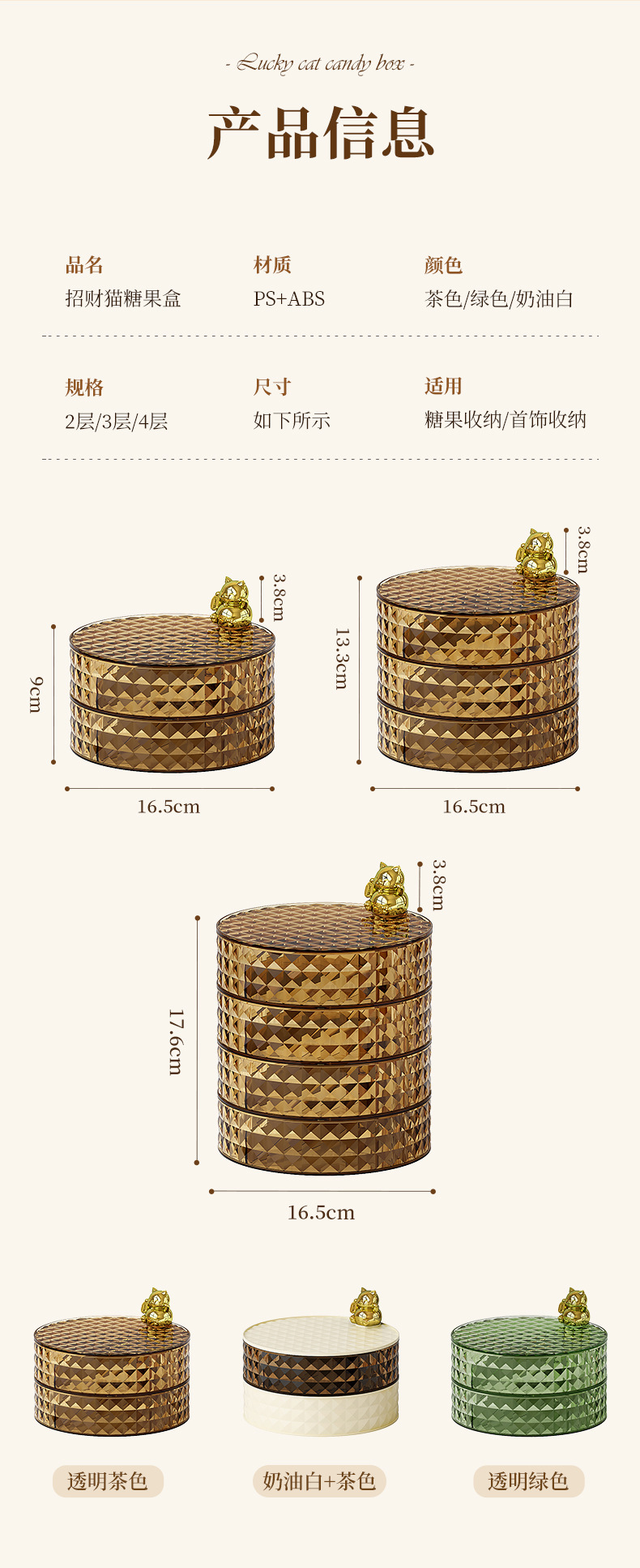 | Color | Dos capas de gato de fortuna de color marrón, dos capas de gato de fortuna verde, dos capas de gato de fortuna de color crema, tres capas de gato de fortuna de color marrón, tres capas de gato de fortuna verde, tres capas de gato de fortuna de color crema, cuatro capas de gato de fortuna de color marrón, cuatro capas de gato de fortuna verde, cuatro capas de gato de fortuna de color crema |