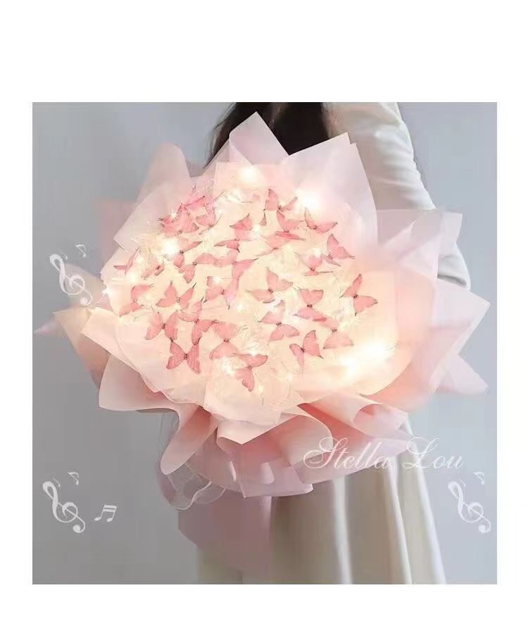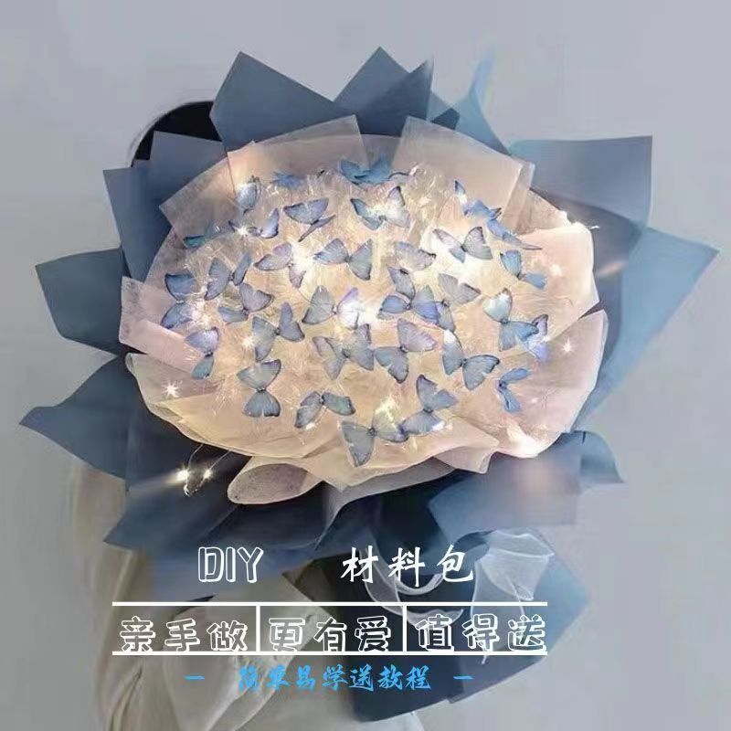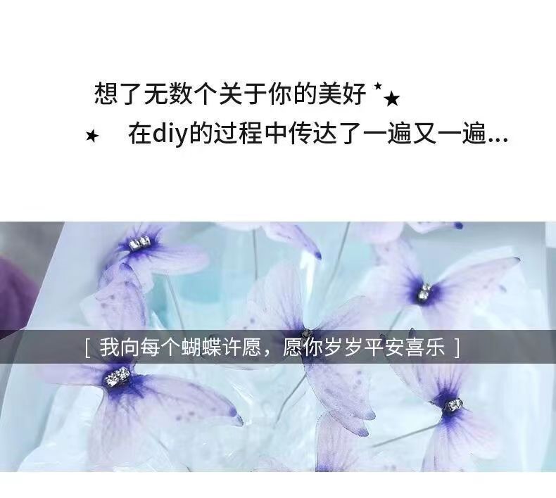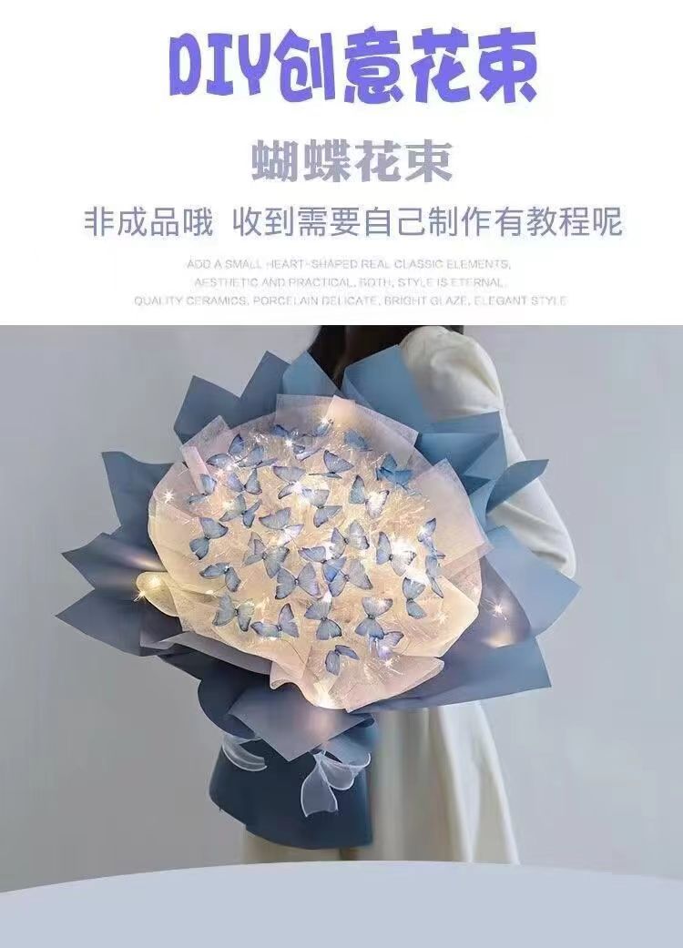 我们发货的是蝴蝶花束材料包,需要通过参考视频教程自己DIY做出花束。