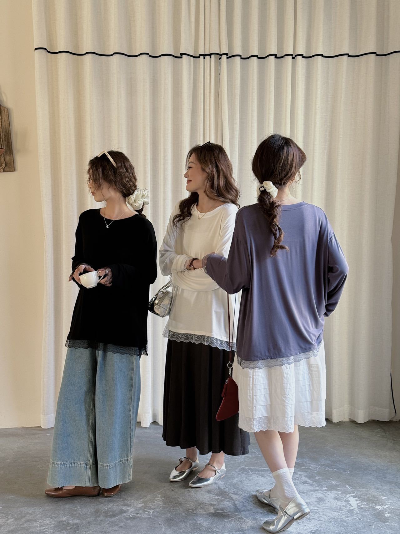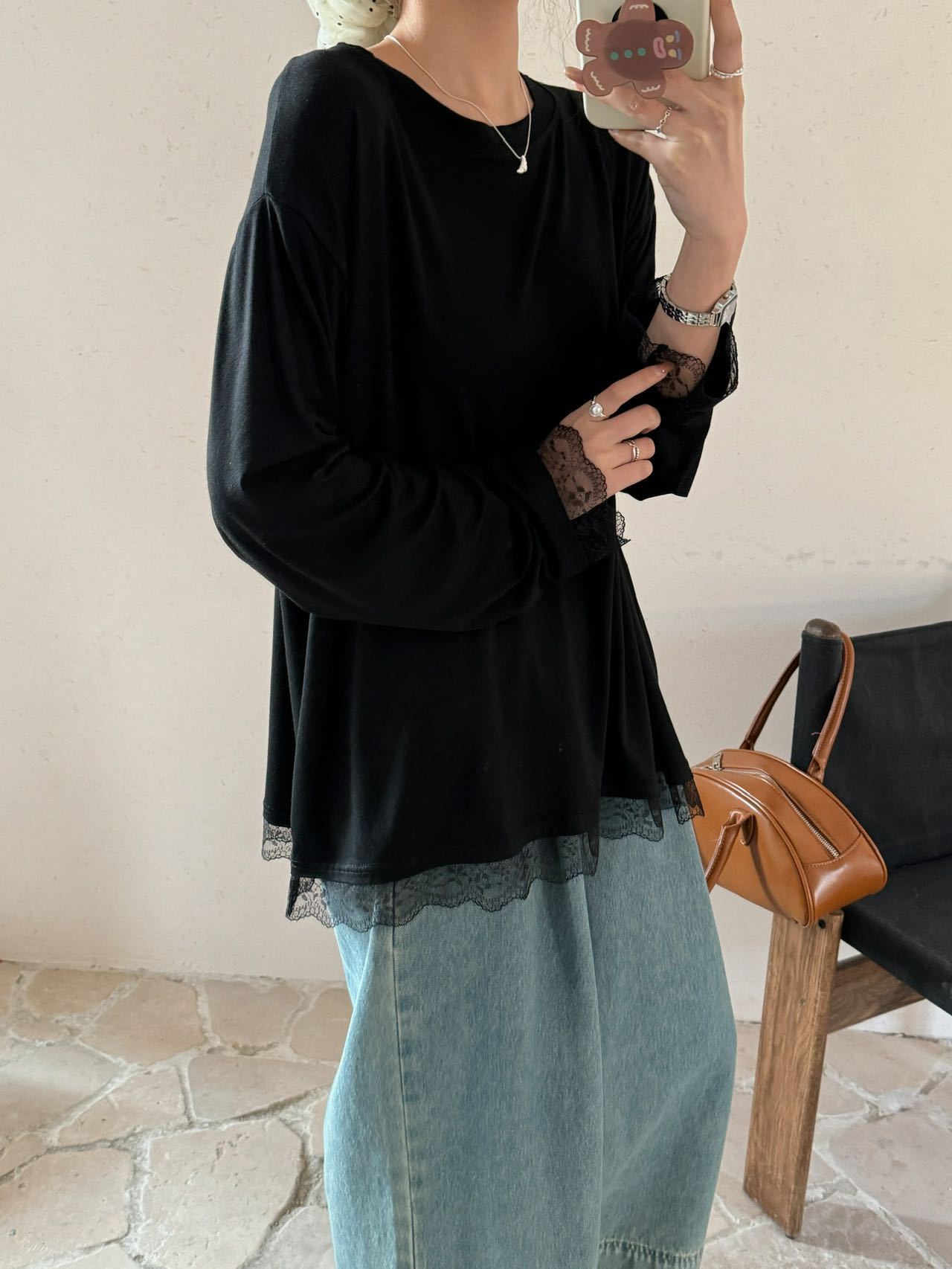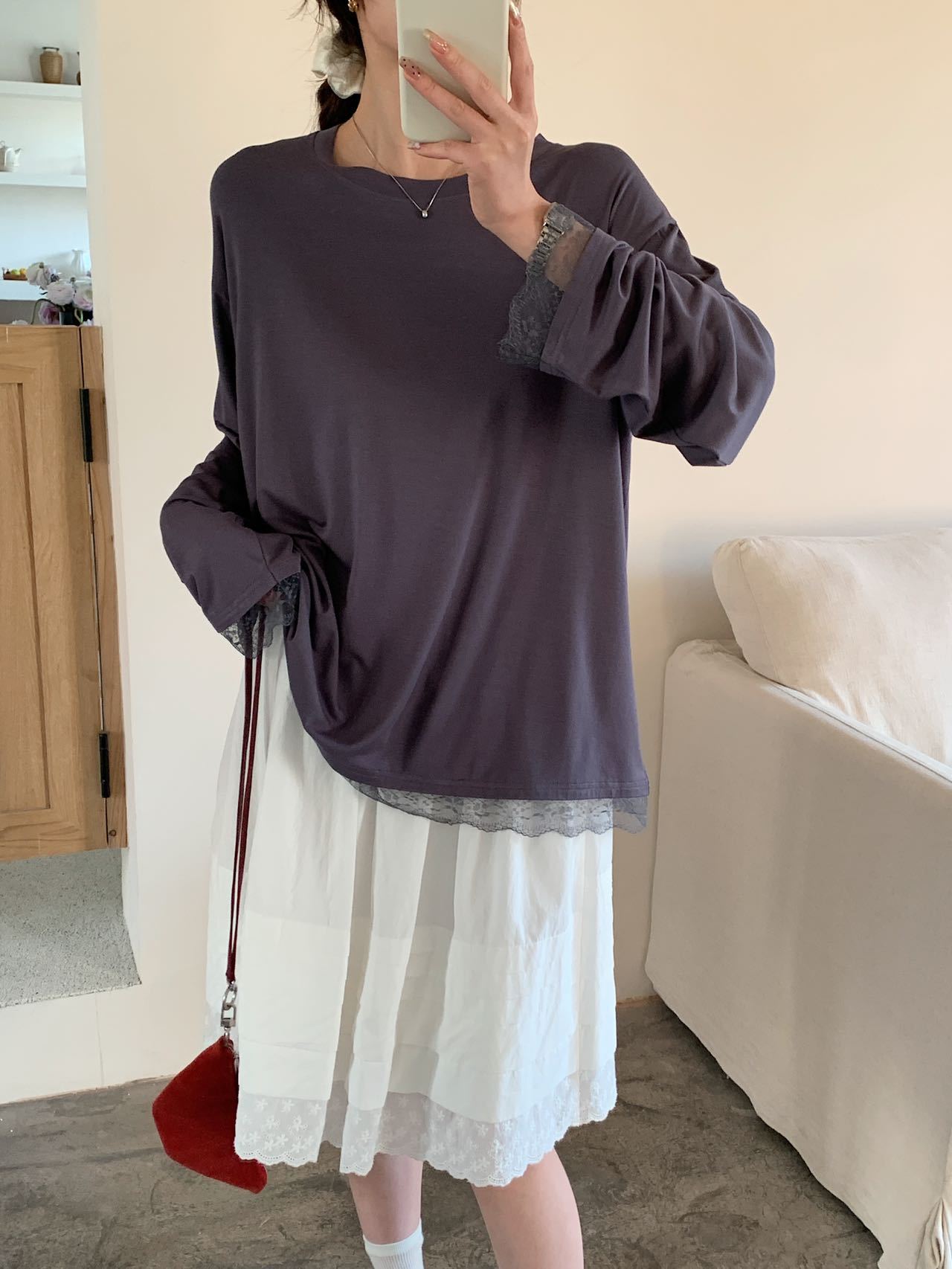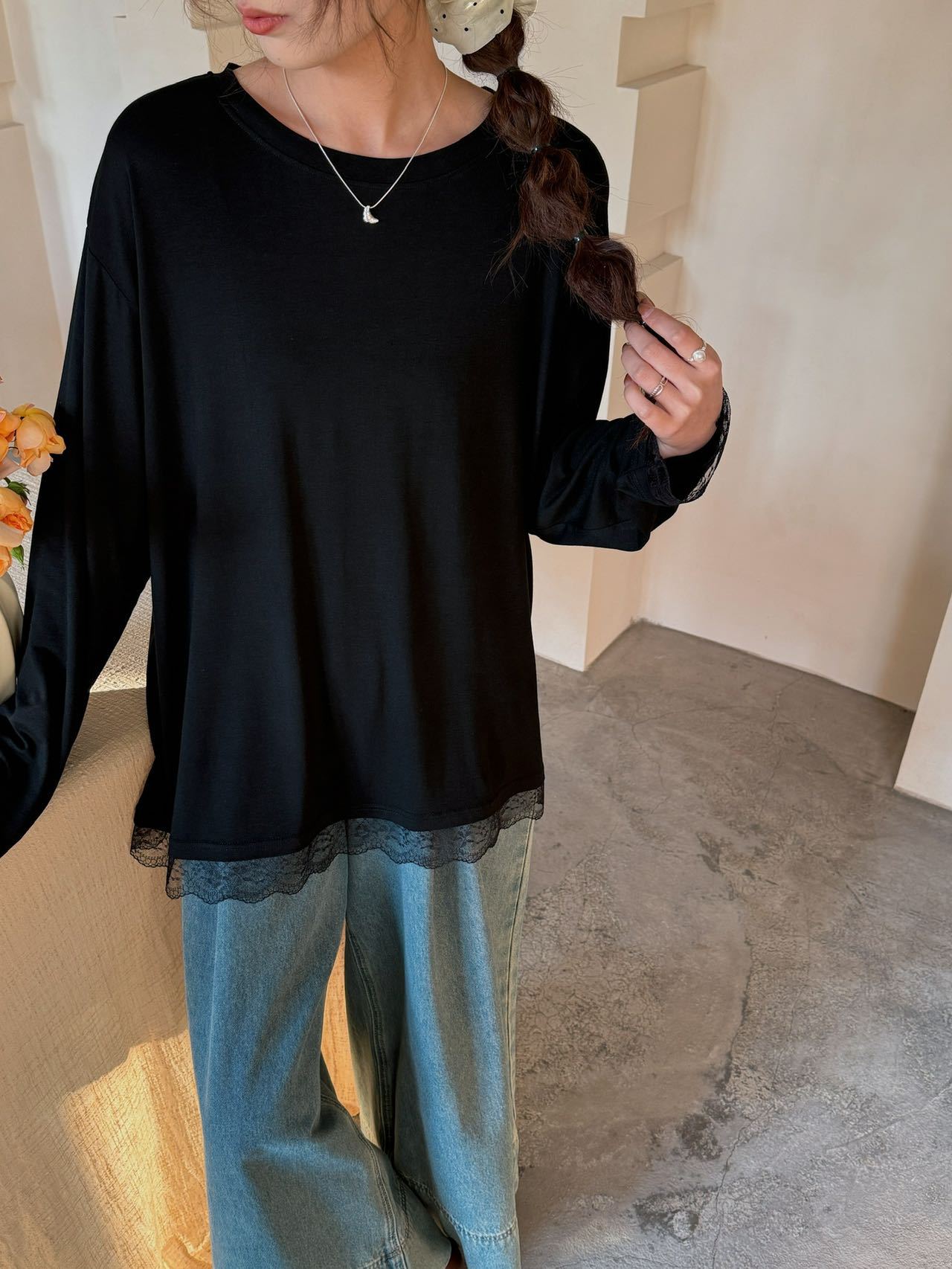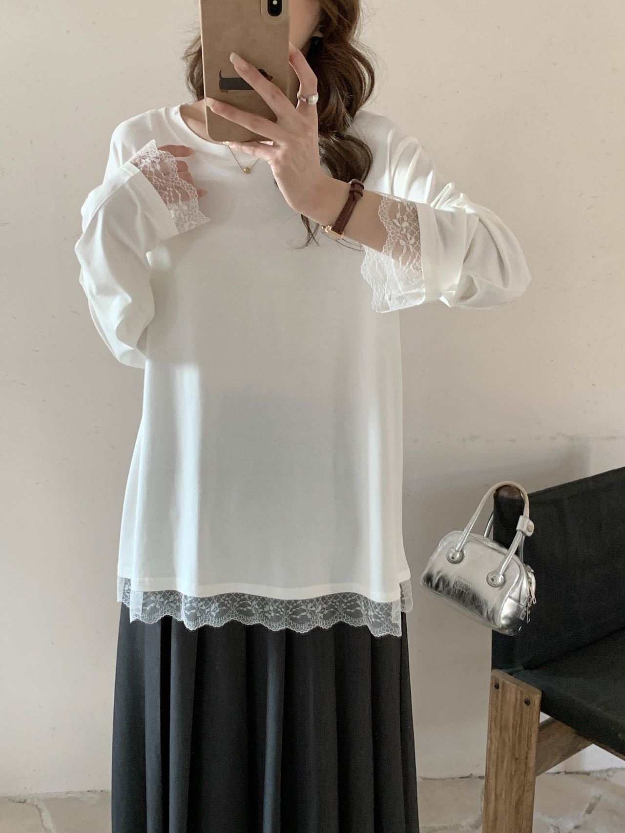 Diseño de la camisa de fondo con costuras de encaje de todo fósforo 2024 otoño e invierno nuevo estilo lijado adelgazante top temperamento de moda femenina