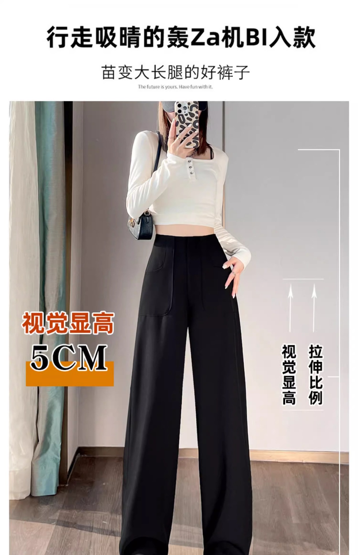 Pantalones de piernas anchas negras de mujeres primavera y otoño 2024 nuevos pantalones rectos de cintura alta y estrecha sensación de pluma de alta calidad pantalones de traje casual