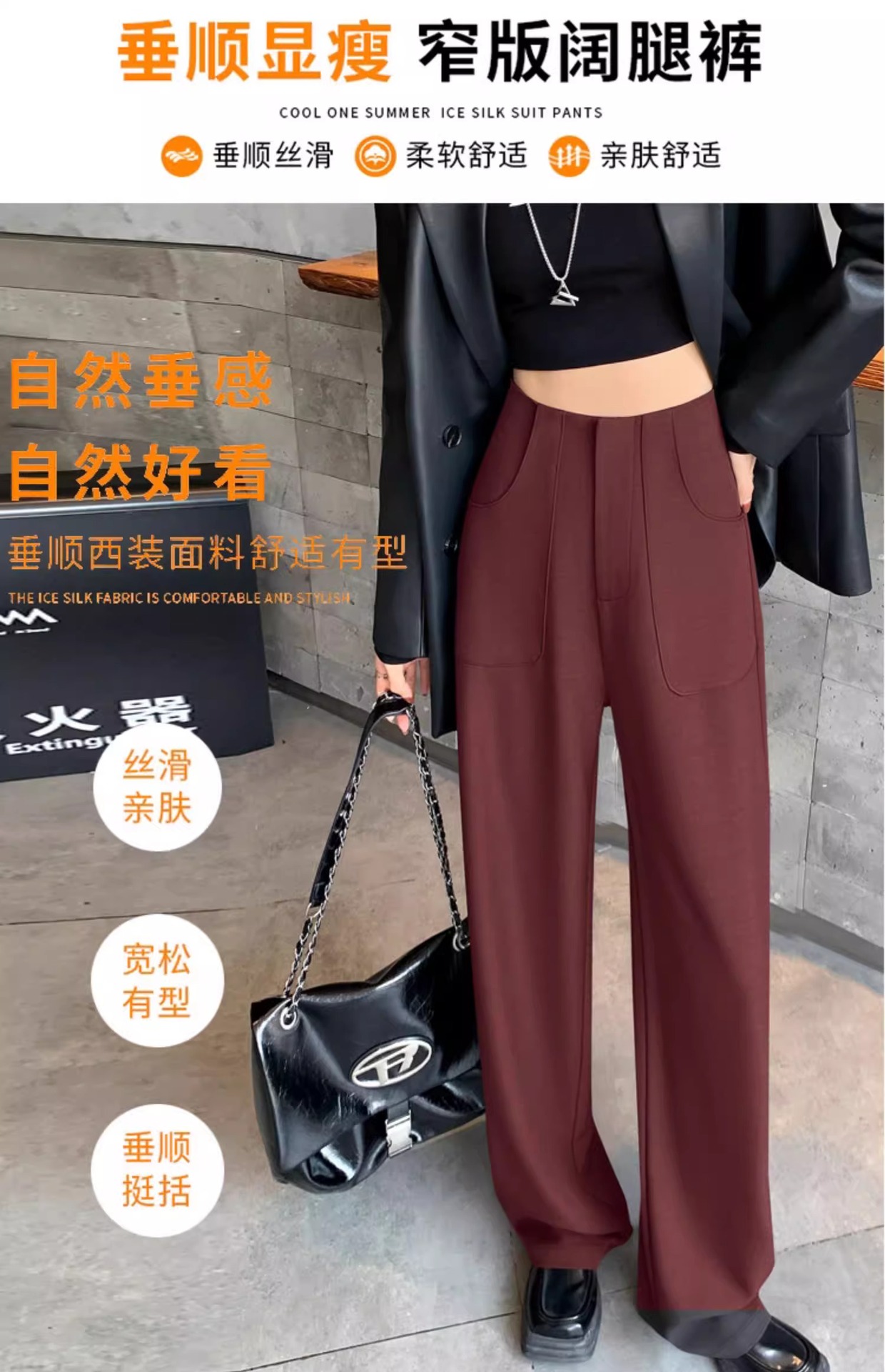 Pantalones de pierna ancha de seda de hielo de estilo explosivo para mujer, cintura alta delgada de verano, protector solar delgado, pantalones casuales de traje recto de versión estrecha