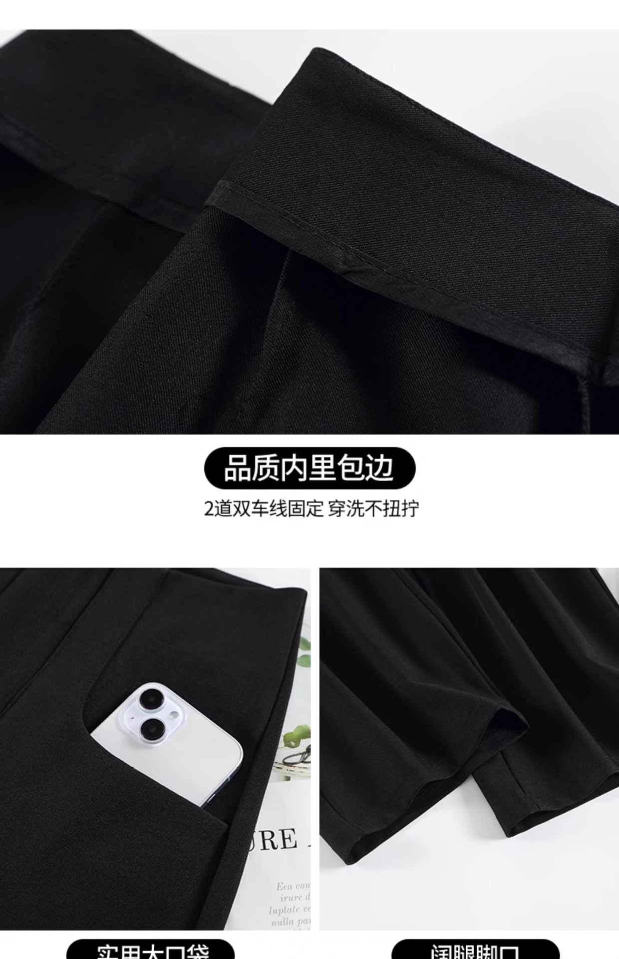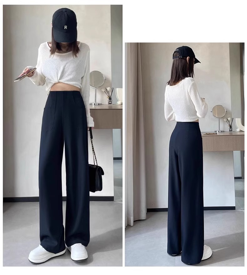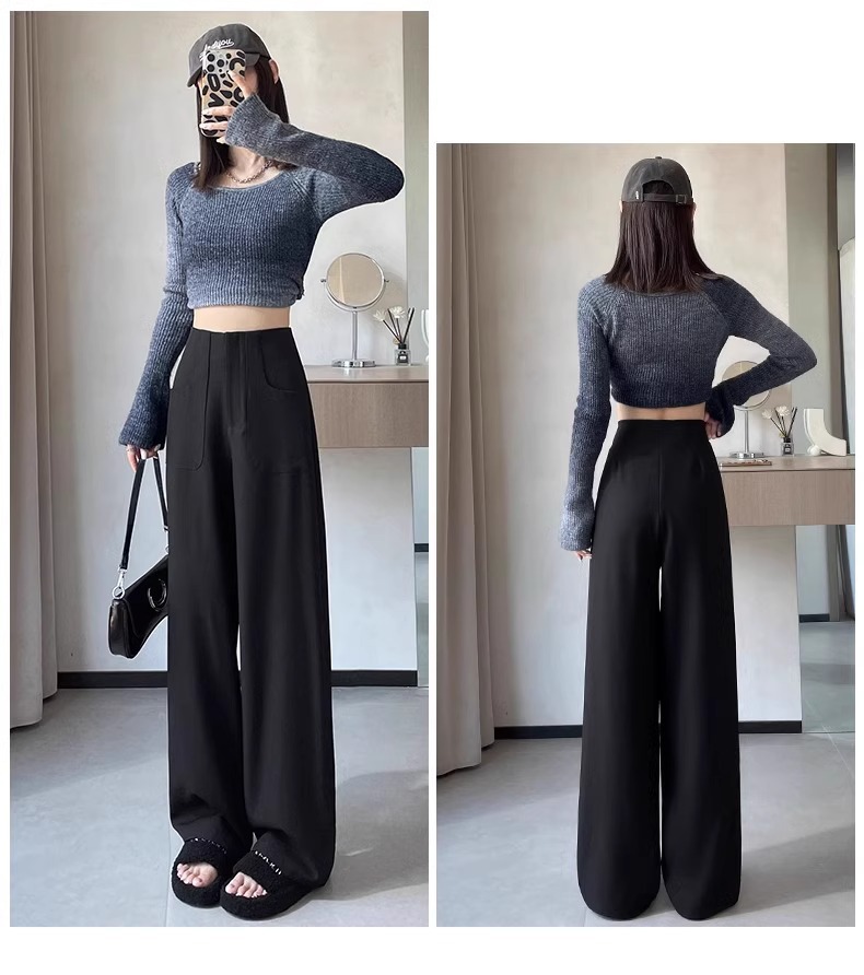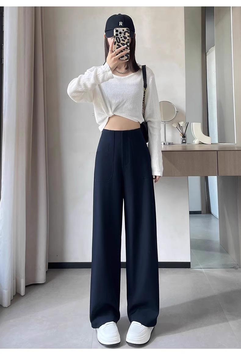Pantalones de piernas anchas negras de mujeres primavera y otoño 2024 nuevos pantalones rectos de cintura alta y estrecha sensación de pluma de alta calidad pantalones de traje casual