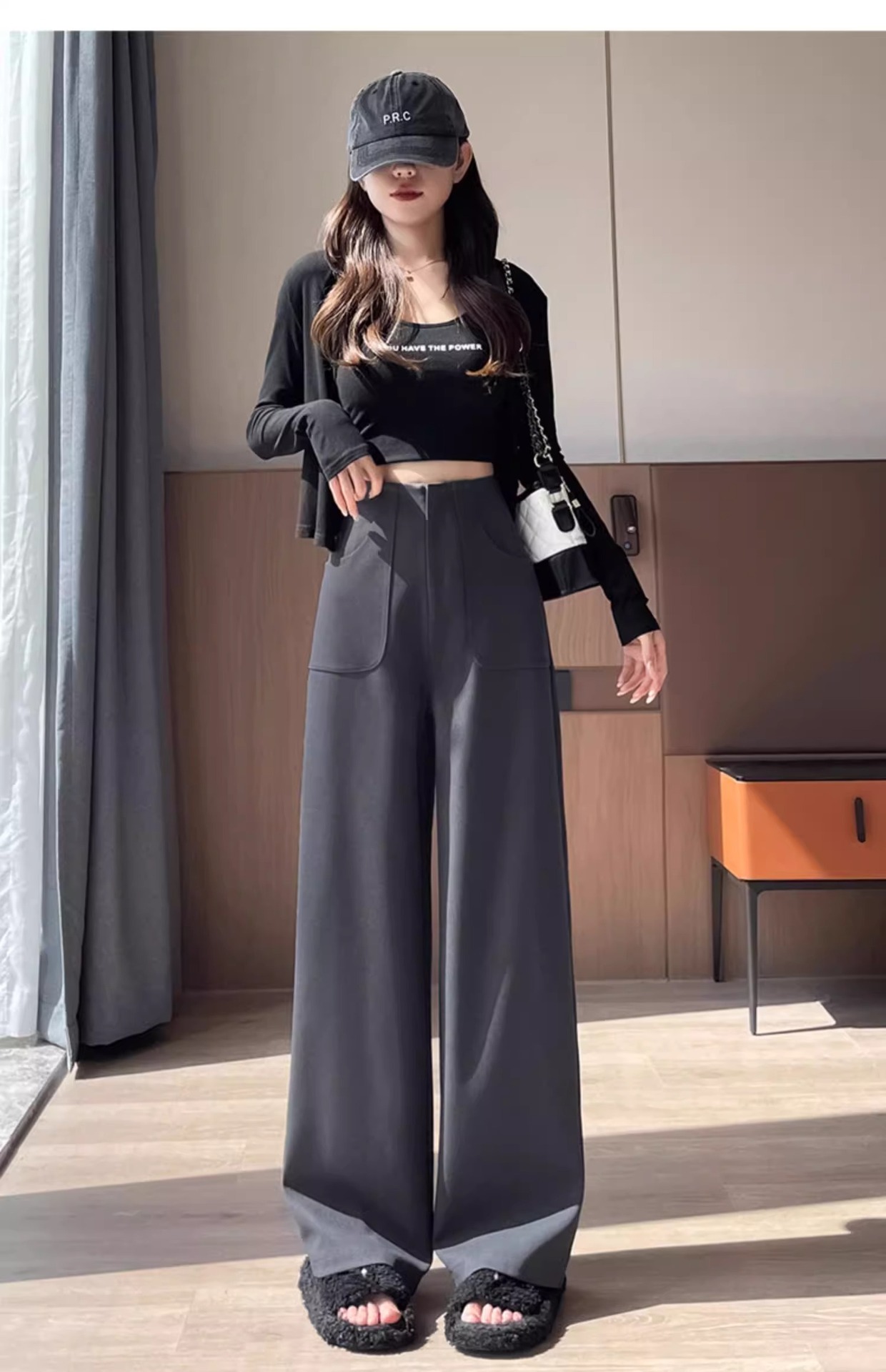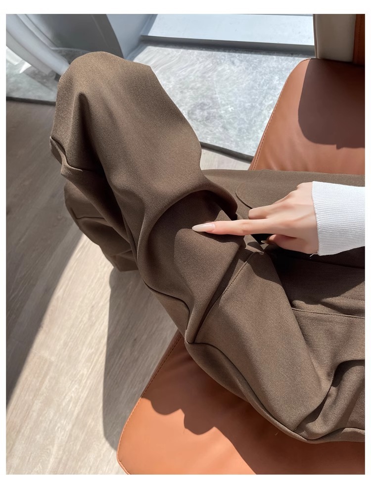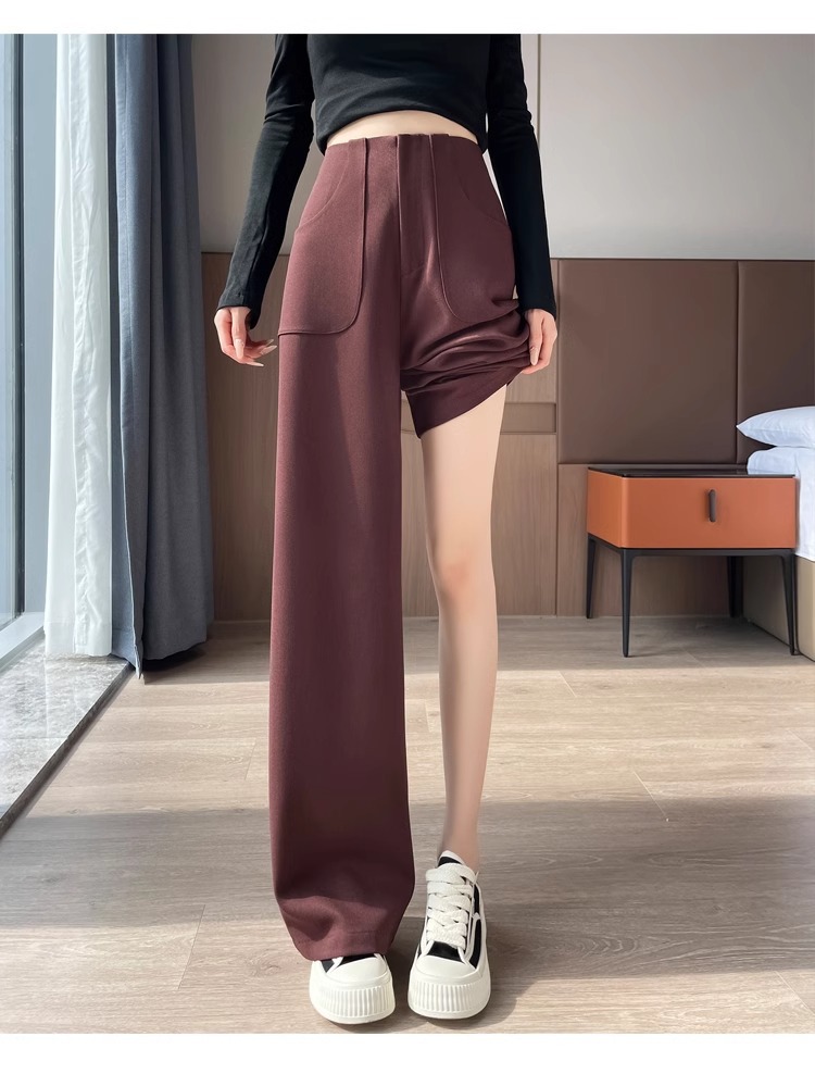 Corea delantera horquilla estrecha pantalones de piernas anchas mujeres pequeñas primavera y otoño recto negro cintura alta sensación de invierno pantalones de traje de invierno
