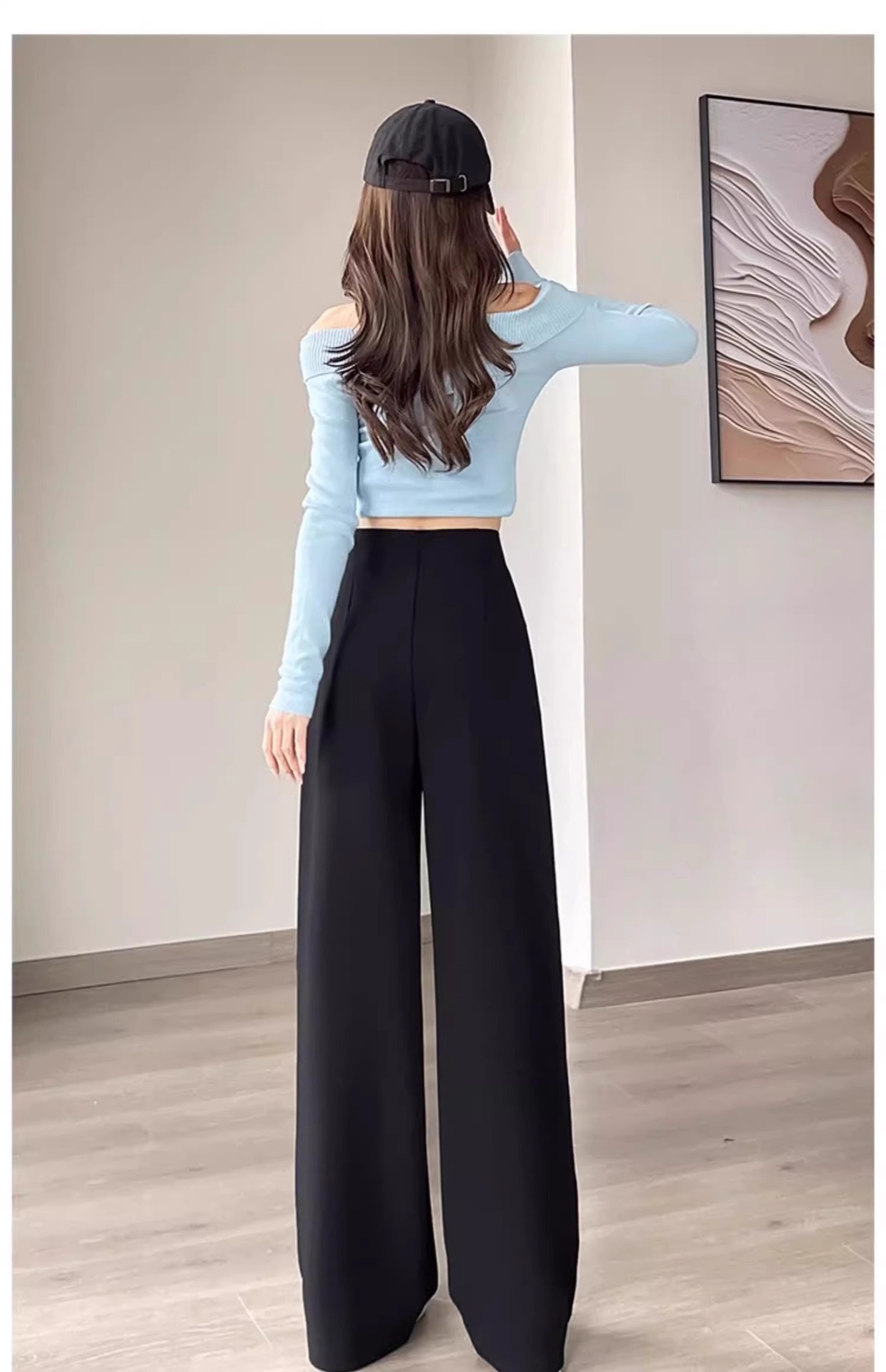 Pantalones de piernas anchas negras de mujeres primavera y otoño 2024 nuevos pantalones rectos de cintura alta y estrecha sensación de pluma de alta calidad pantalones de traje casual