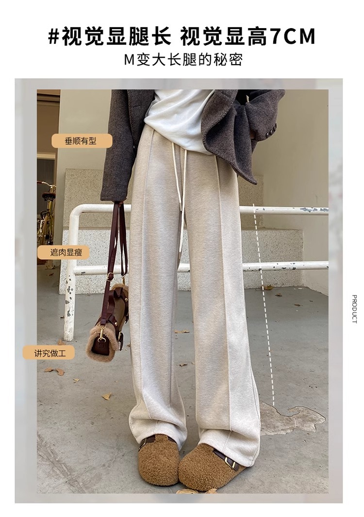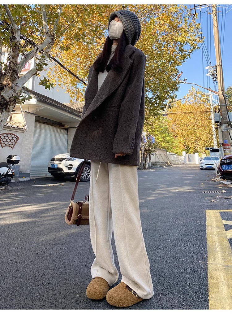 Pantalones de piernas anchas de lana blanca de arroz para mujeres otoño y invierno 2024 cintura alta casual pantalones rectos y estrechos pantalones de traje de herringbone