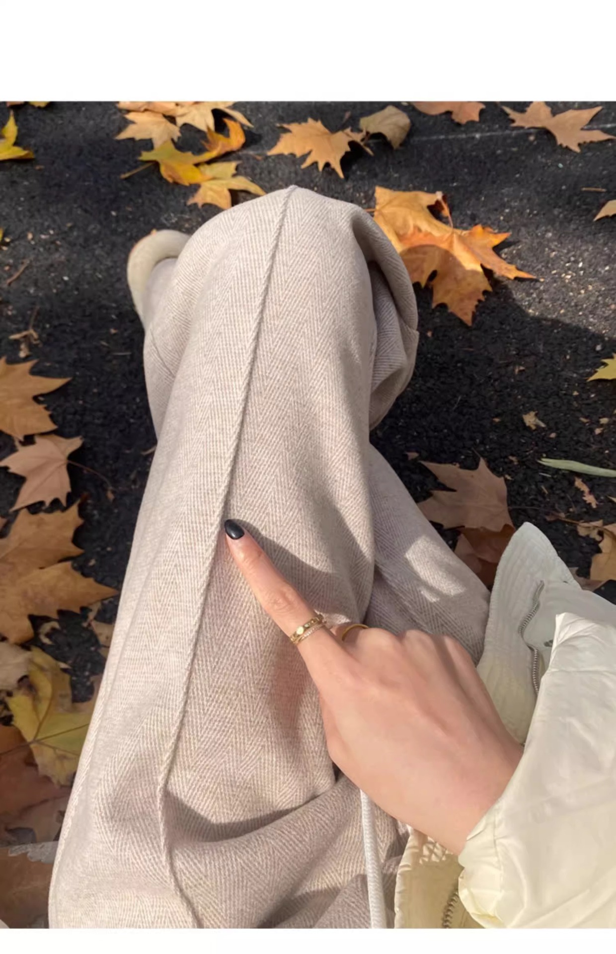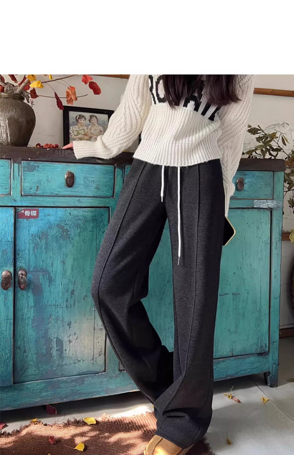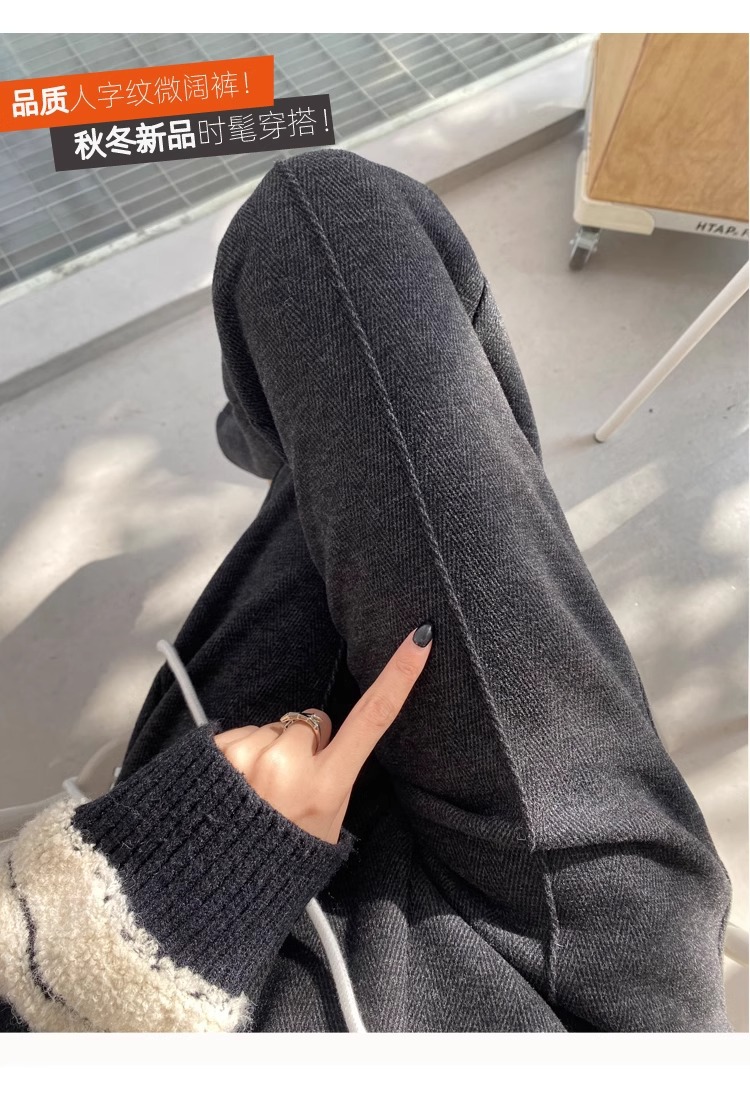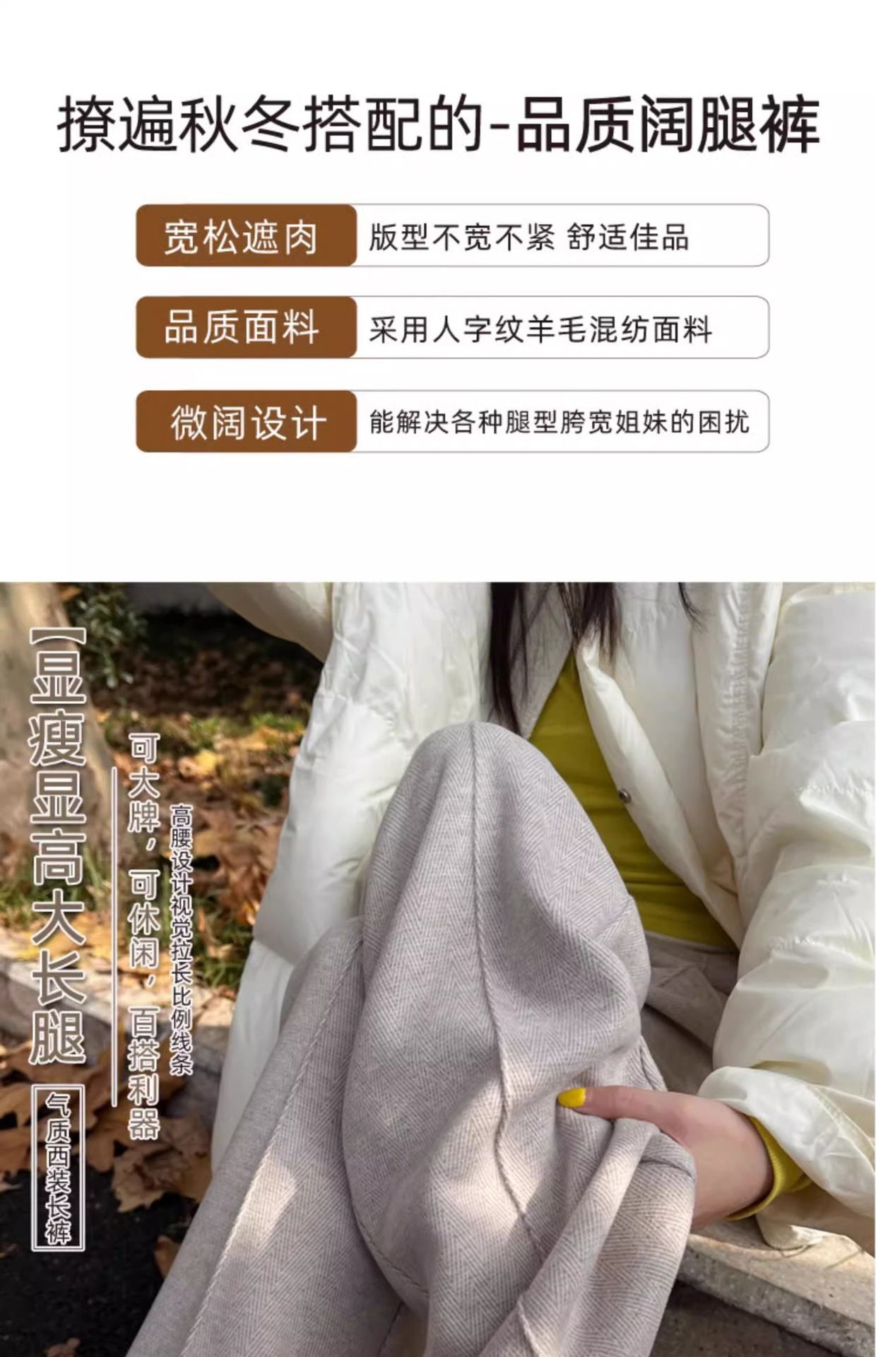 Pantalones de piernas anchas más gruesas para mujeres otoño y invierno de 2024 nuevos pantalones de cintura alta, pantalones casuales, pantalones rectos de lana a herringbone
