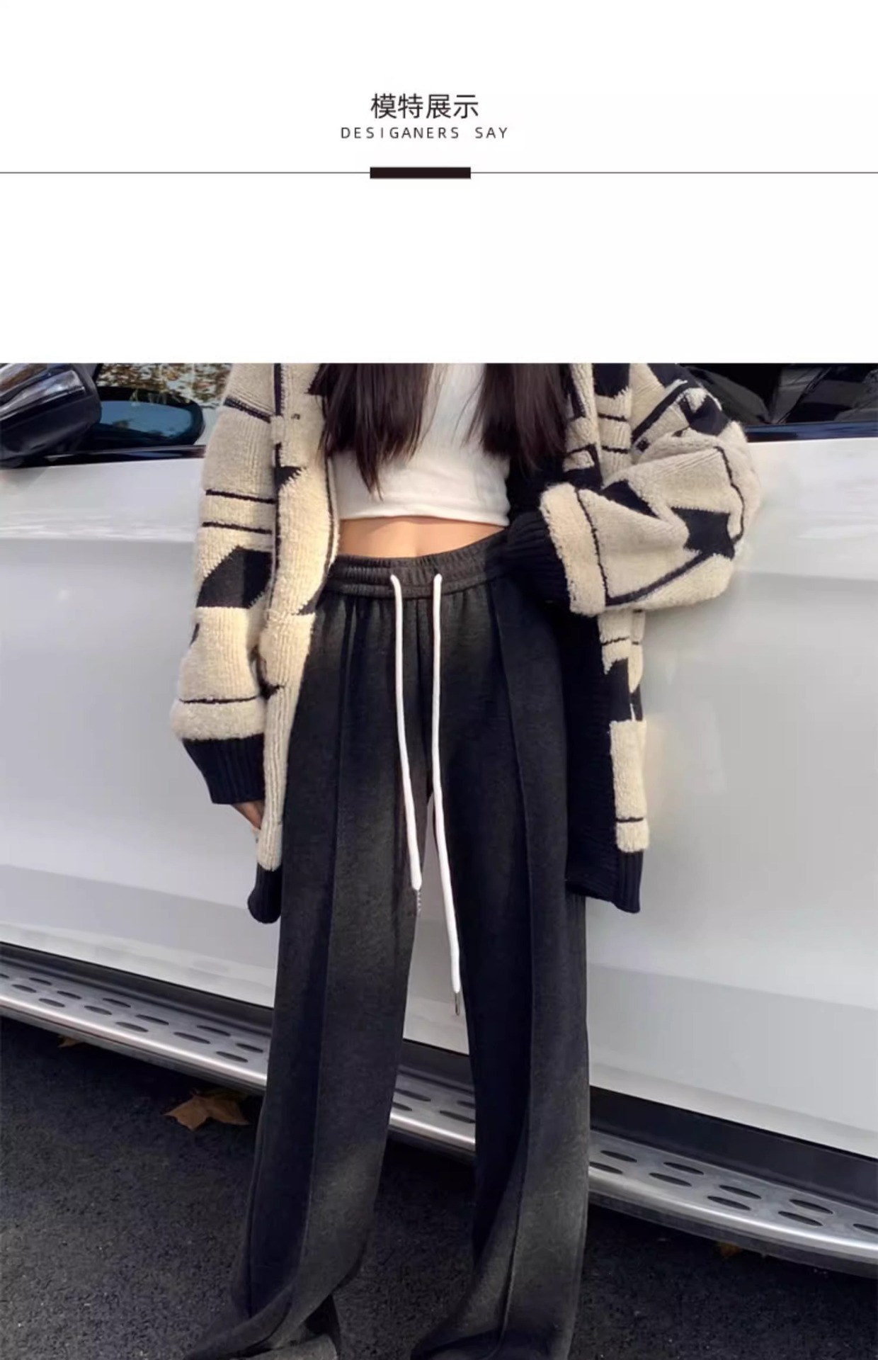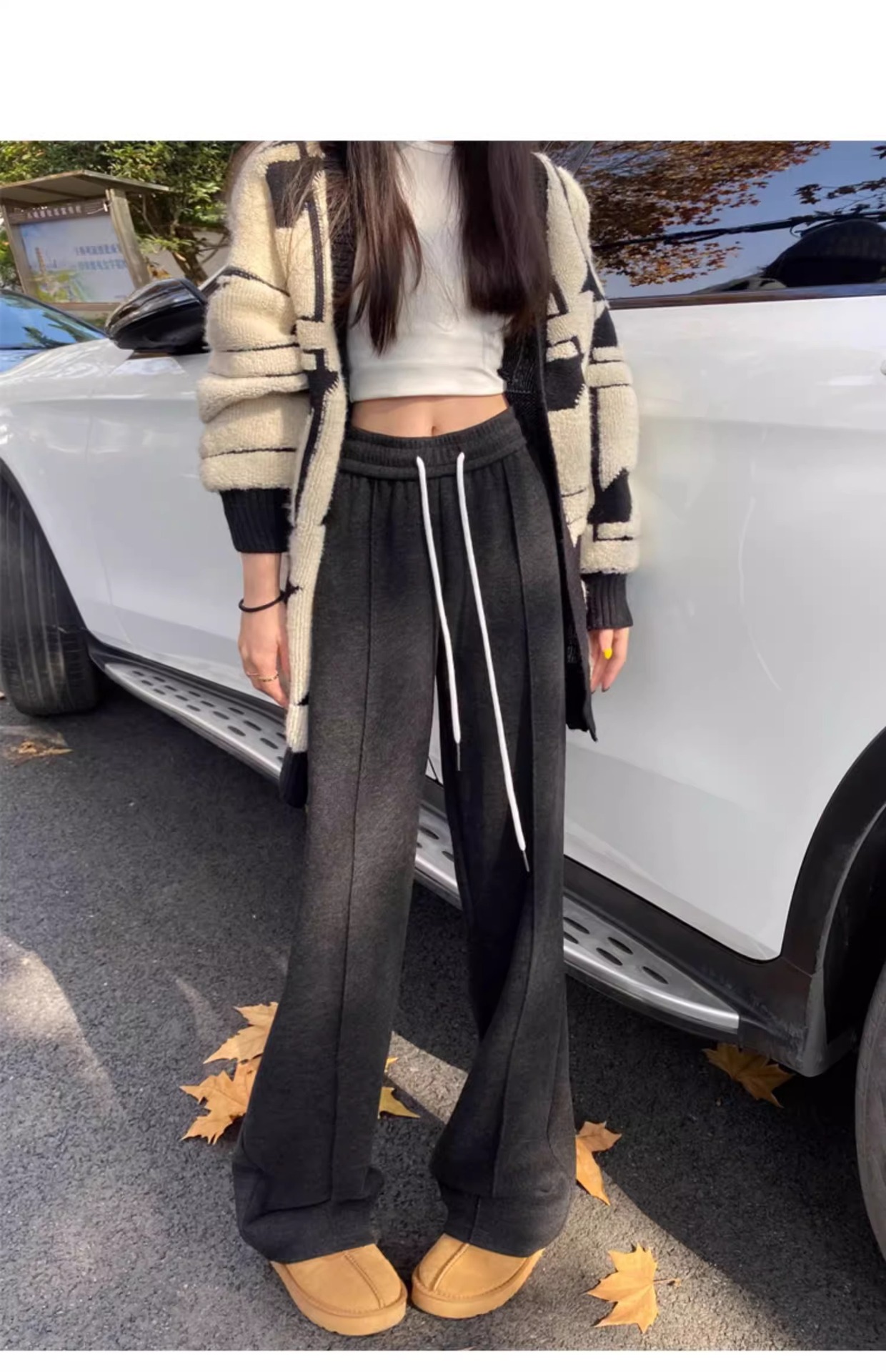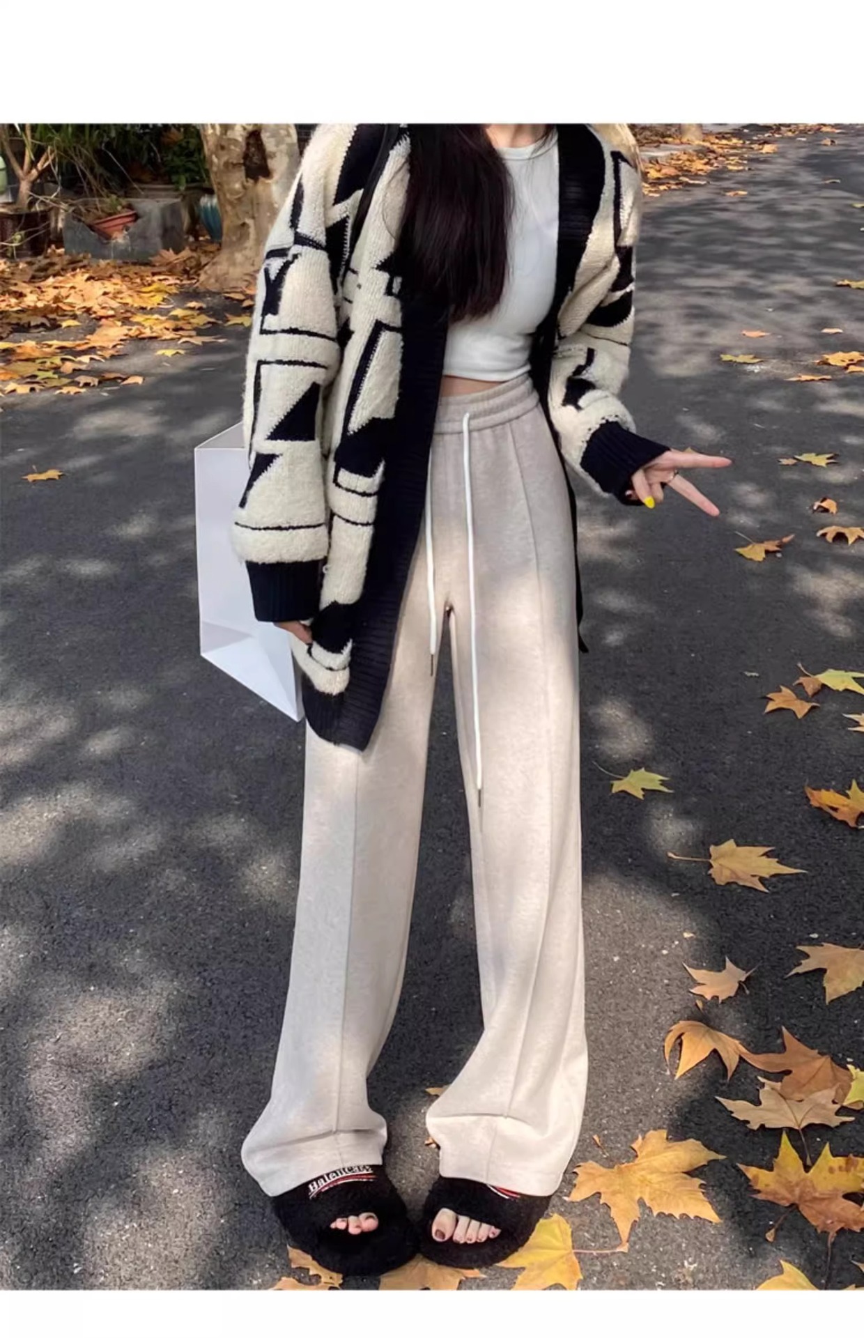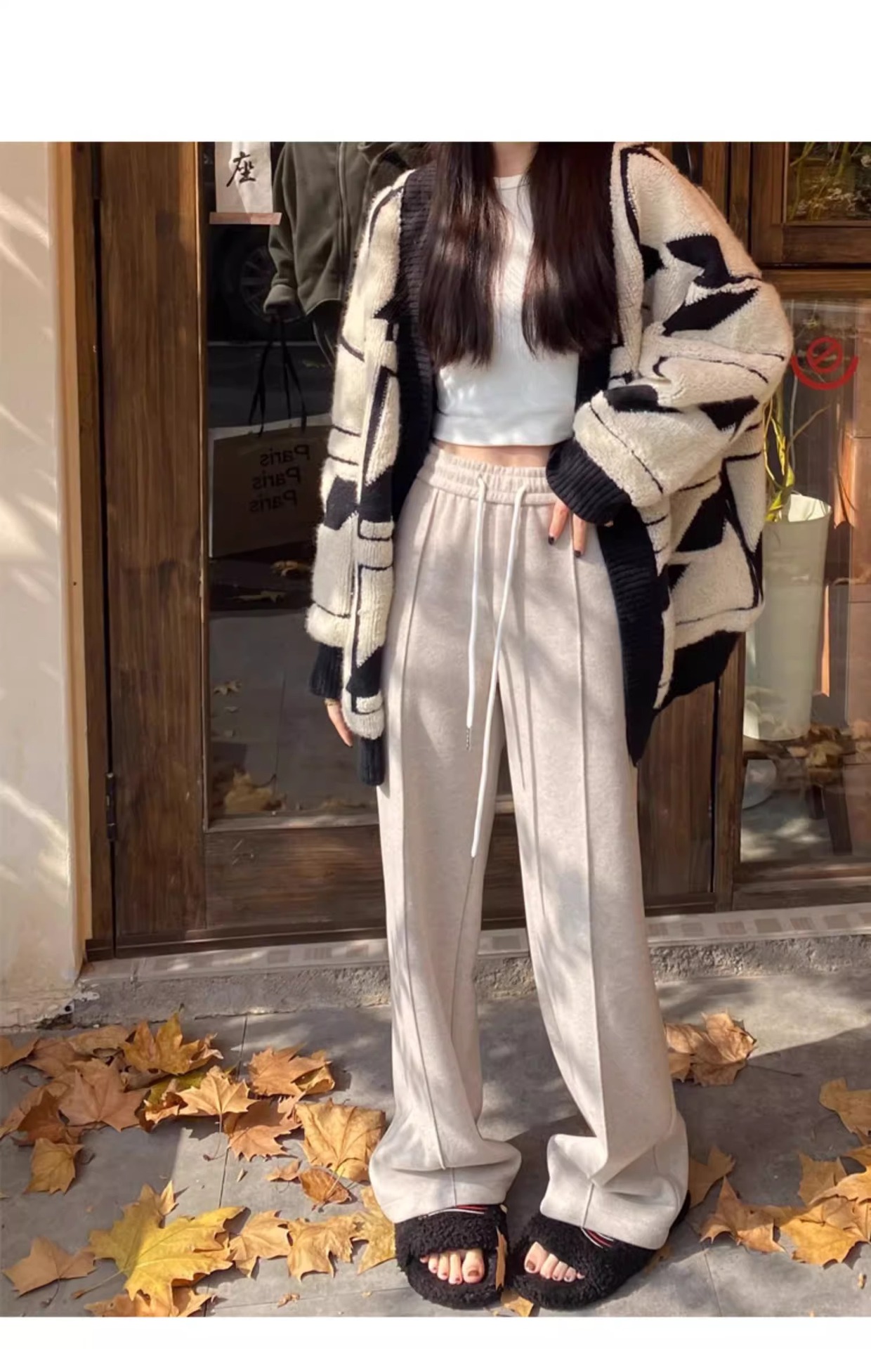 Pantalones de deporte negros de mujer pequeño otoño y invierno nuevo estilo de cintura alta sensación de caída pantalones casuales sueltos pantalones rectos de piernas anchas