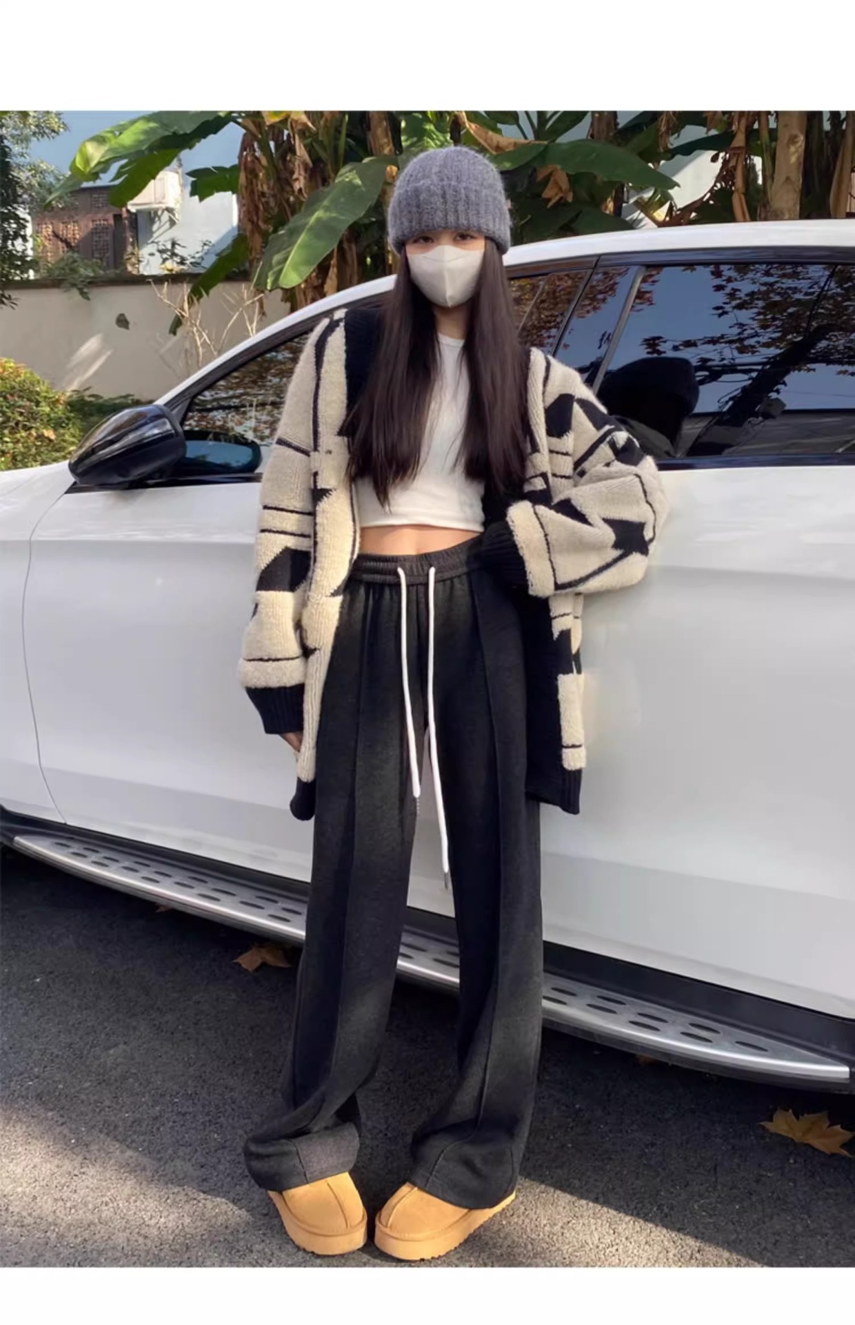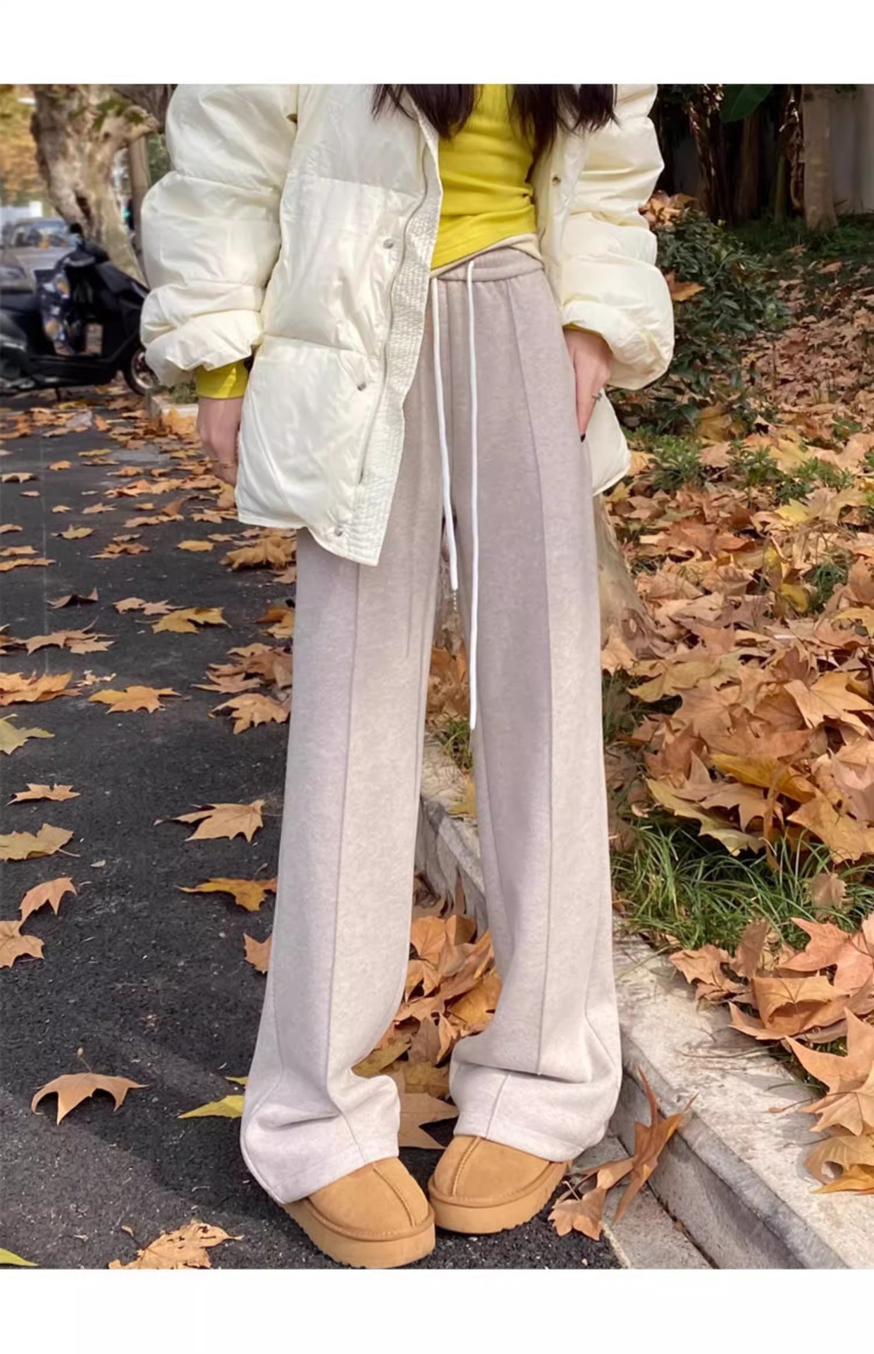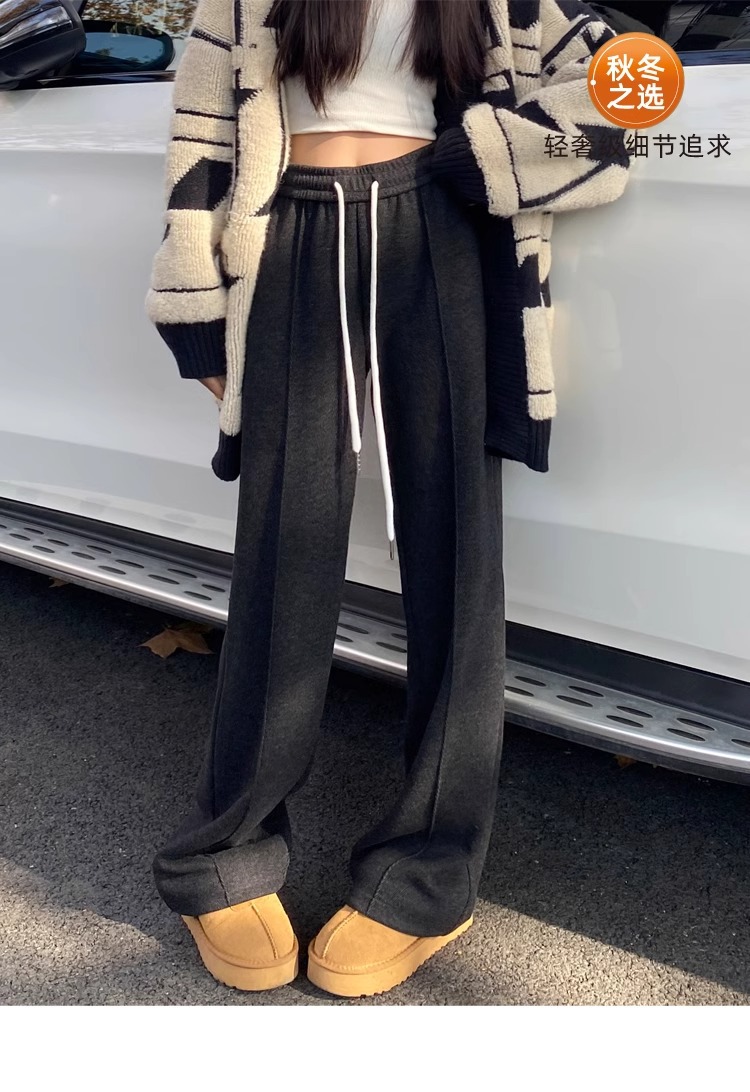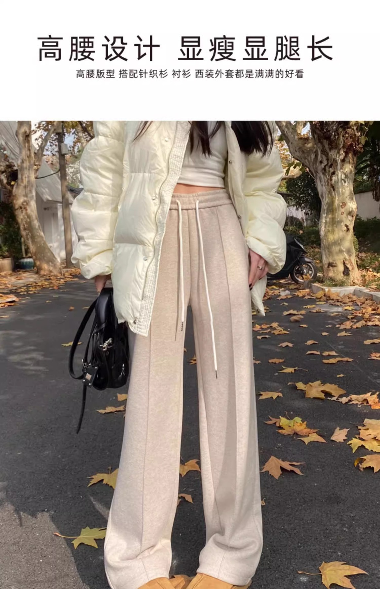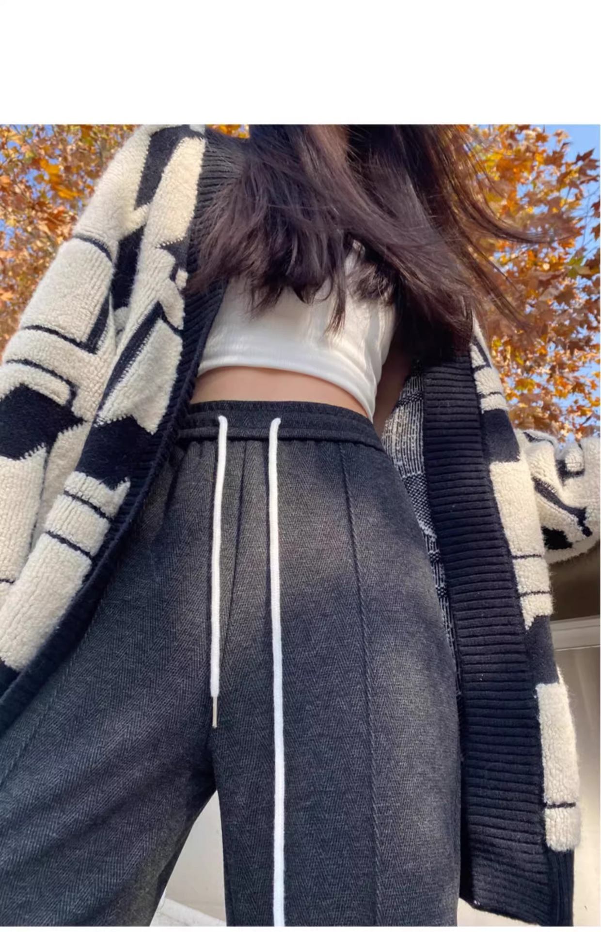 Pantalones de deporte negros de mujer pequeño otoño y invierno nuevo estilo de cintura alta sensación de caída pantalones casuales sueltos pantalones rectos de piernas anchas