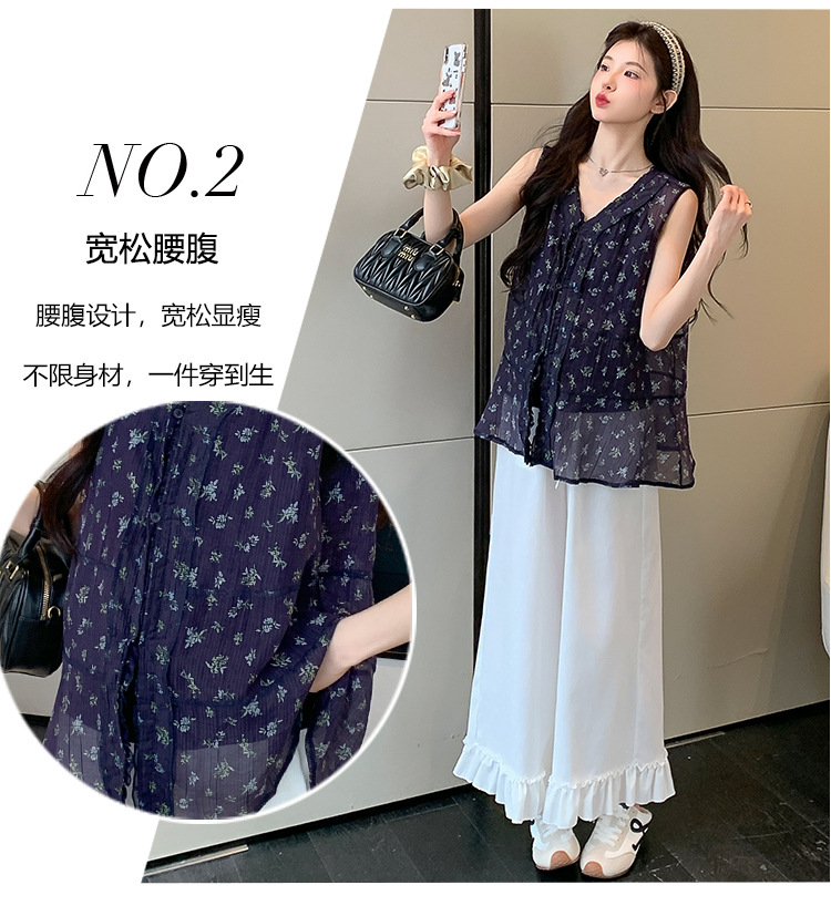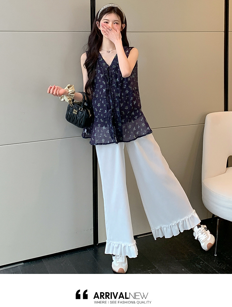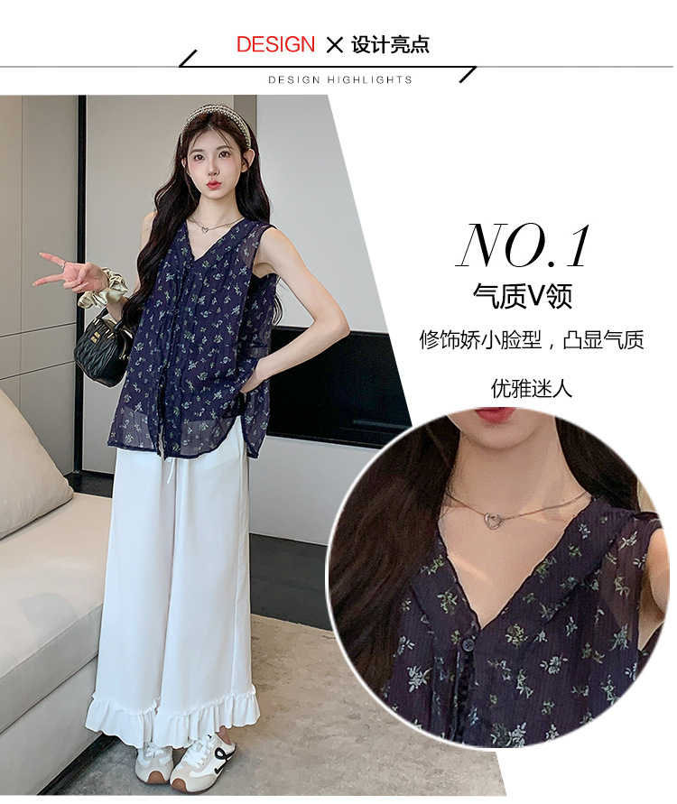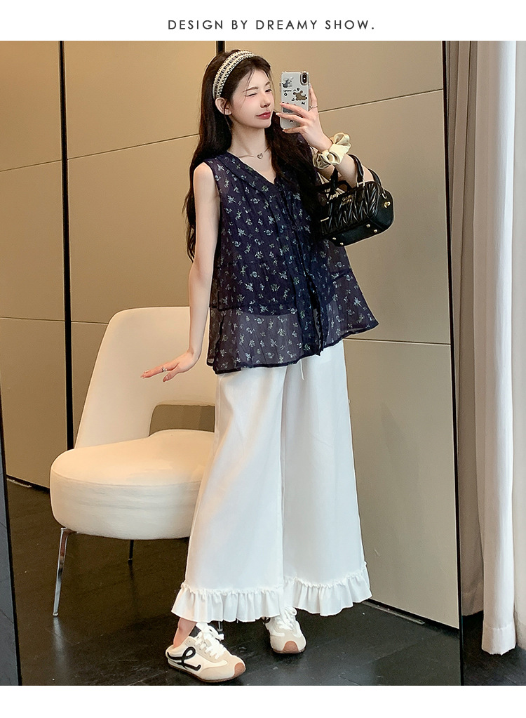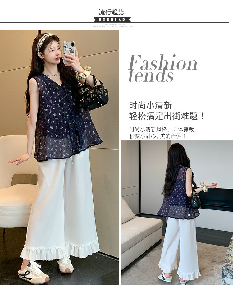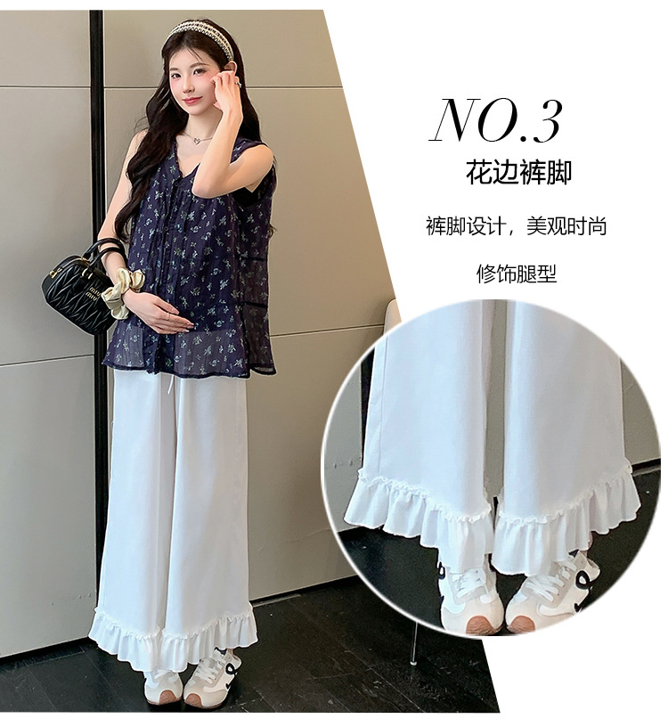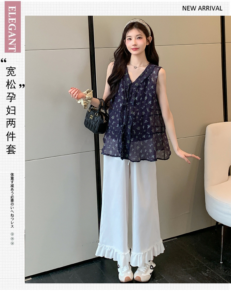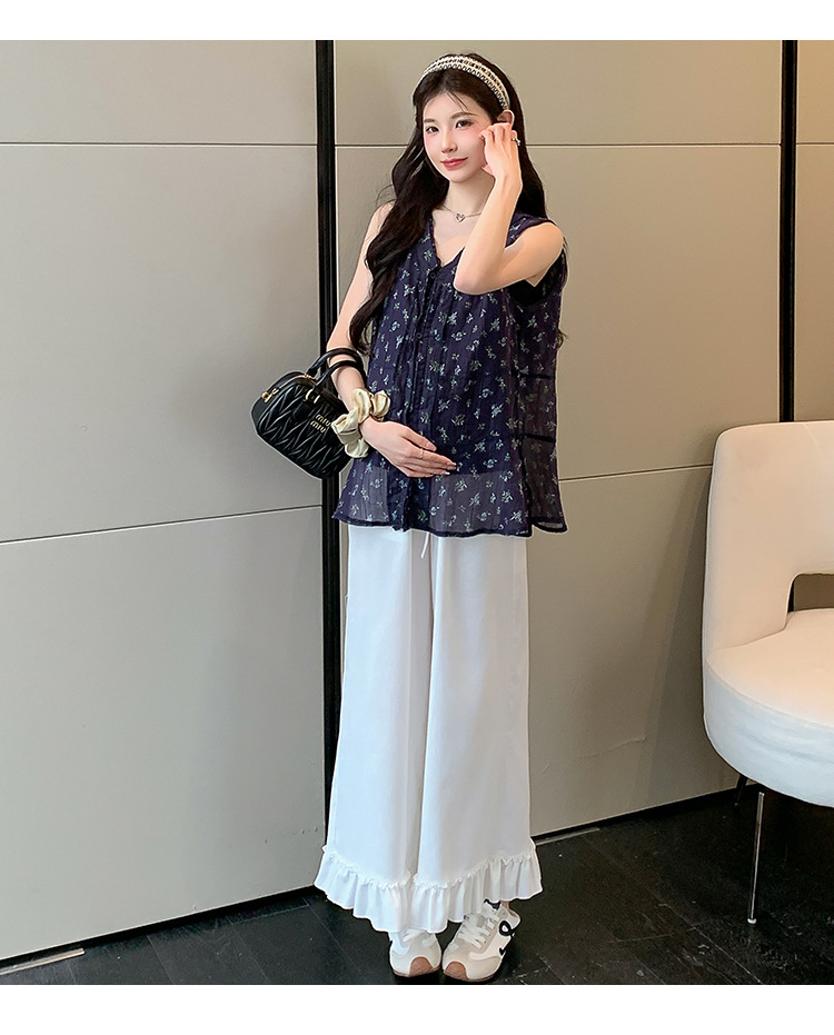 2025 verano nuevo estilo pequeño tirantes florales sin mangas top con volantes pantalones anchos durante el embarazo traje de maternidad