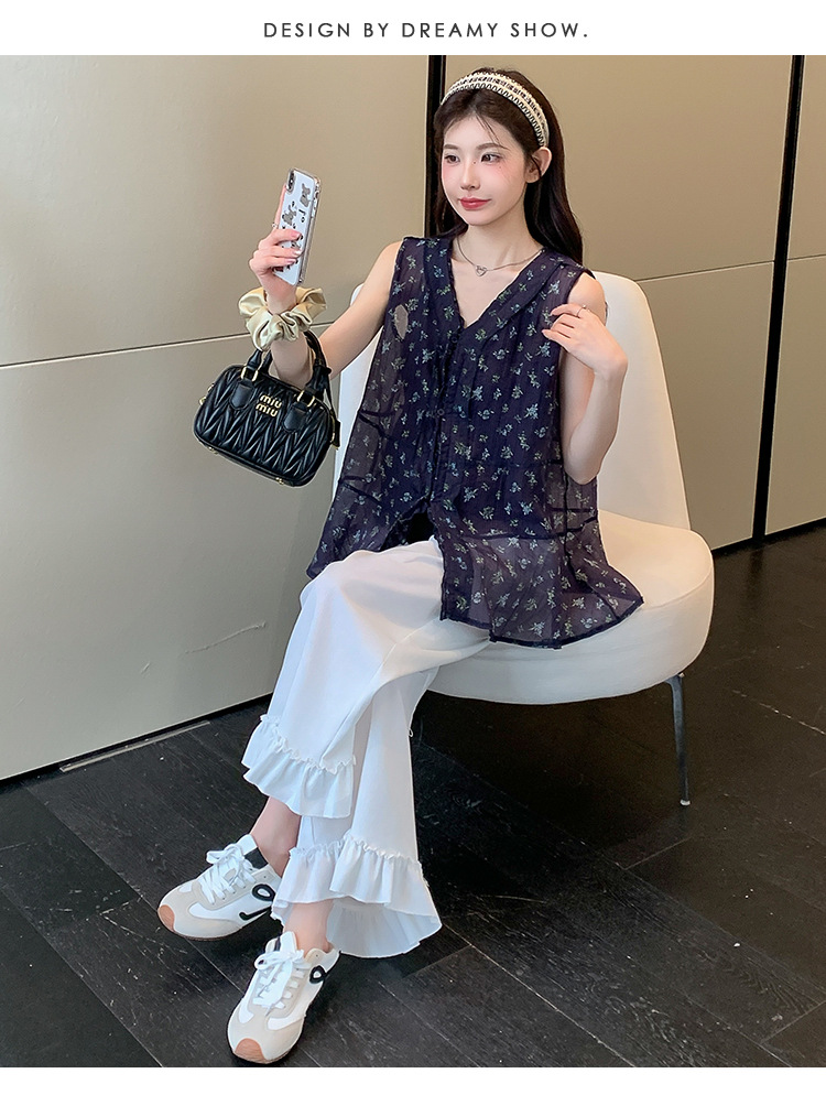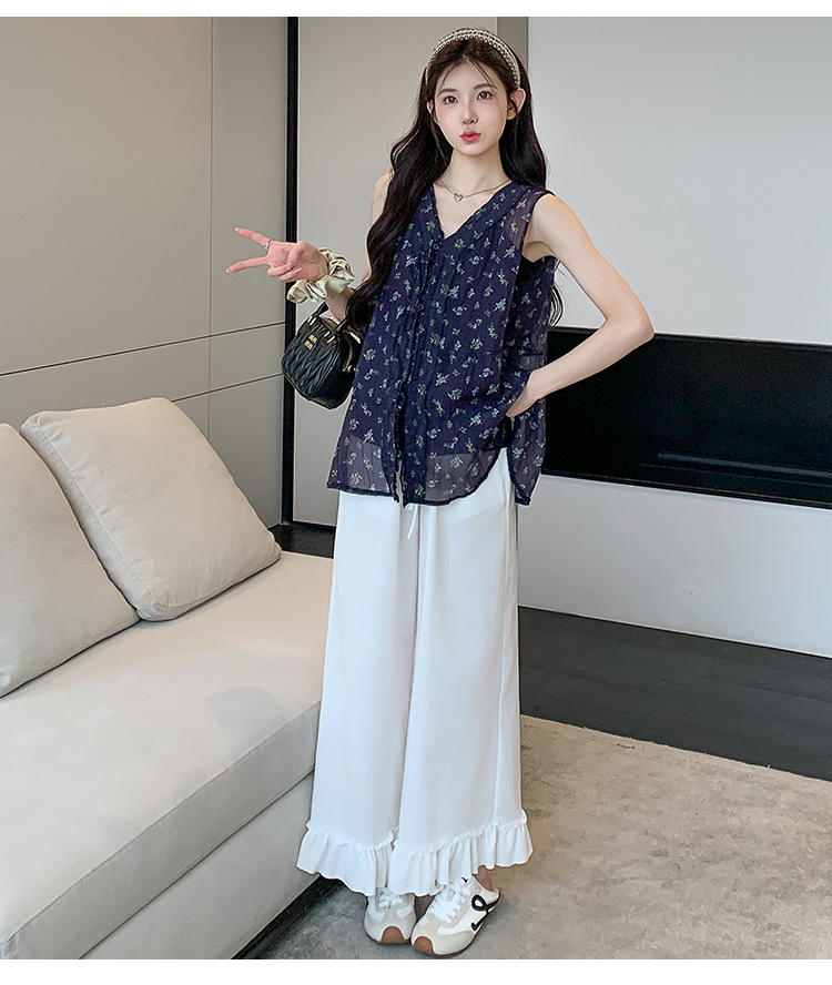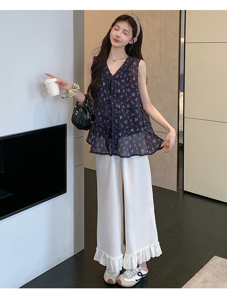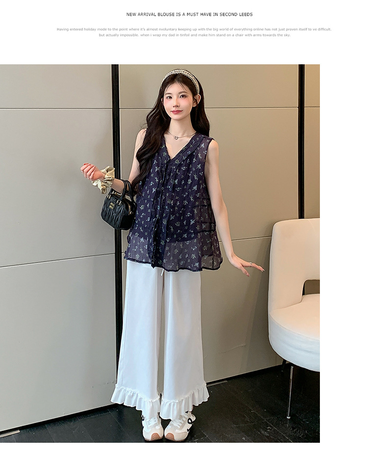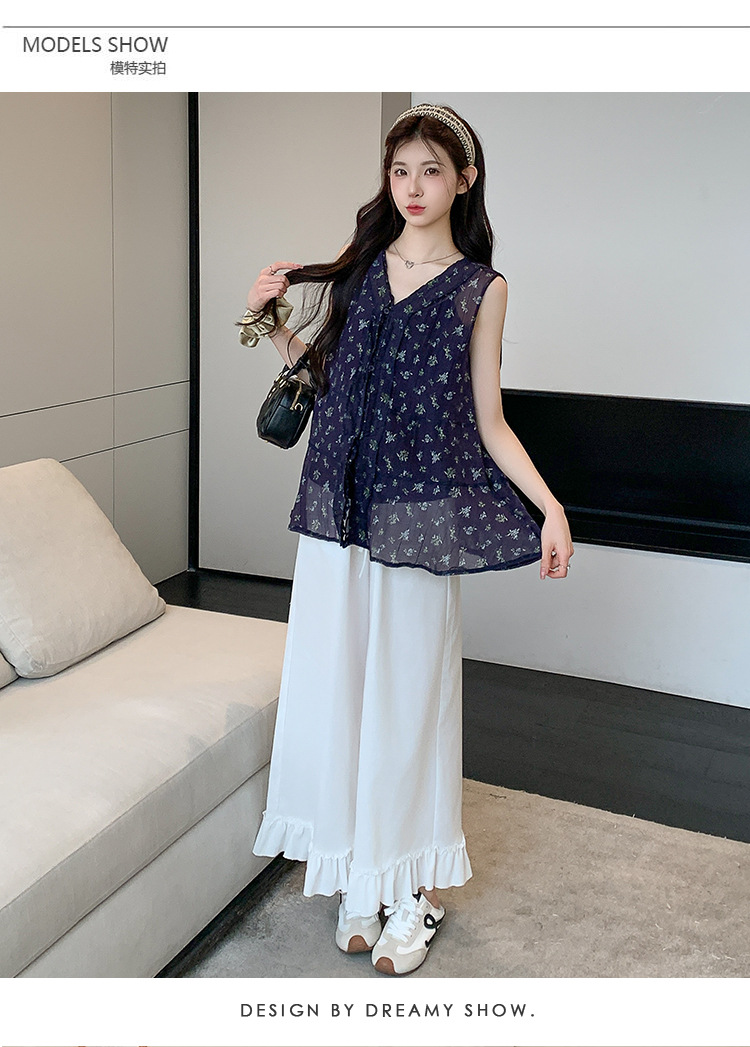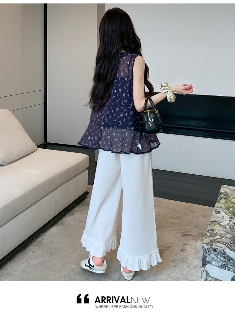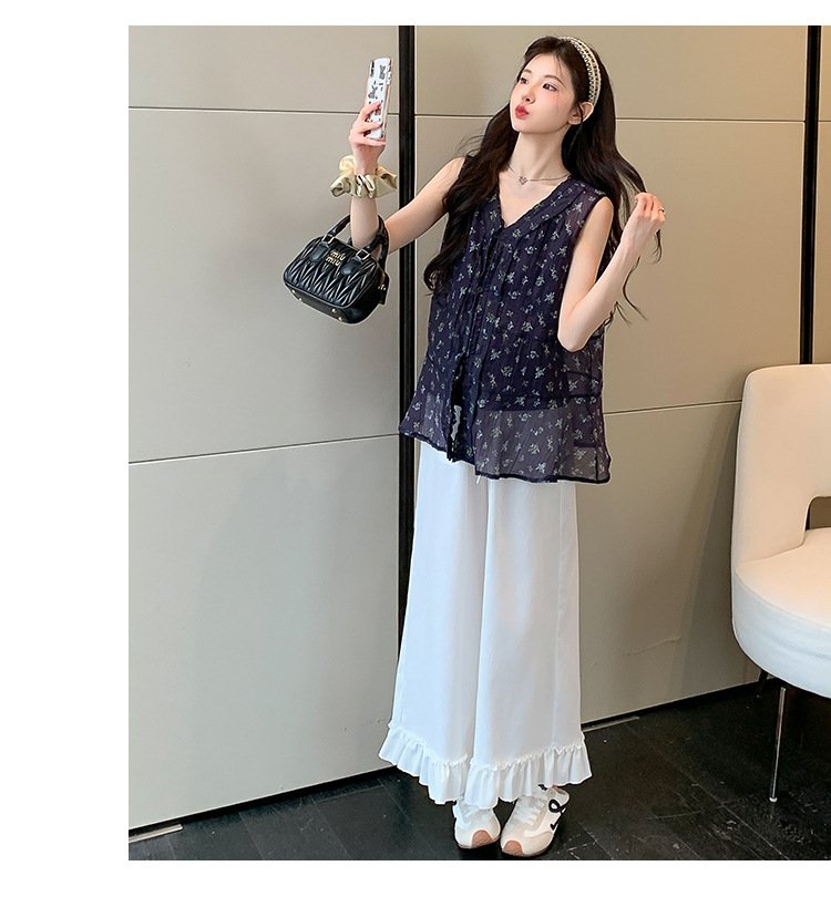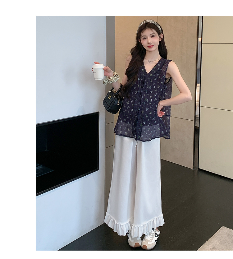 2025 verano nuevo estilo pequeño tirantes florales sin mangas top con volantes pantalones anchos durante el embarazo traje de maternidad