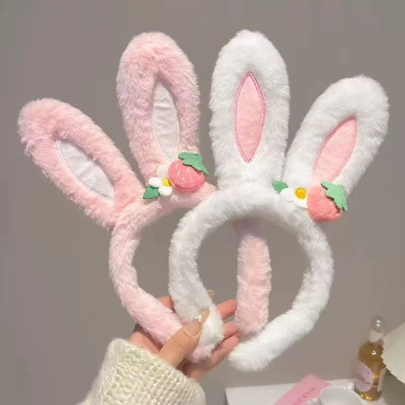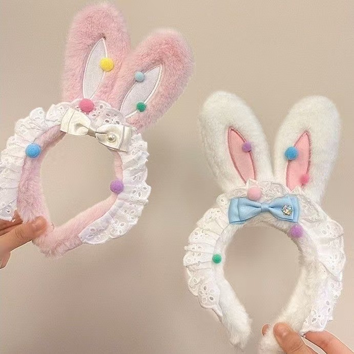 新款可爱蝴蝶结兔耳朵毛绒发箍蕾丝花边洗脸头箍儿童发卡头饰批发