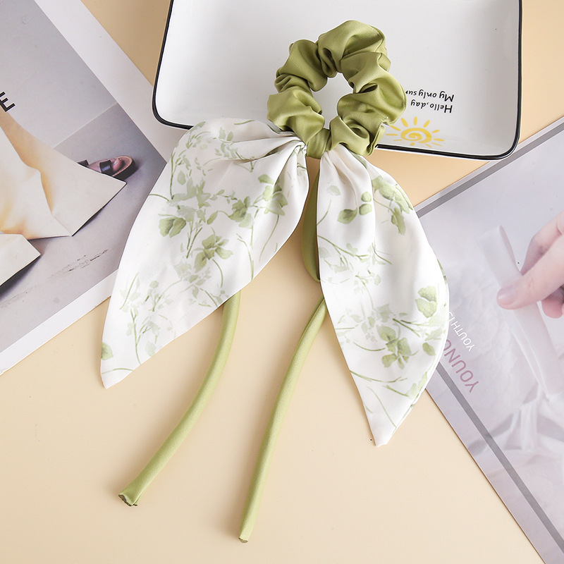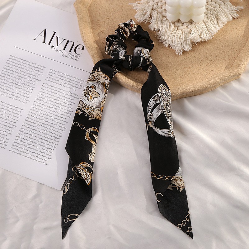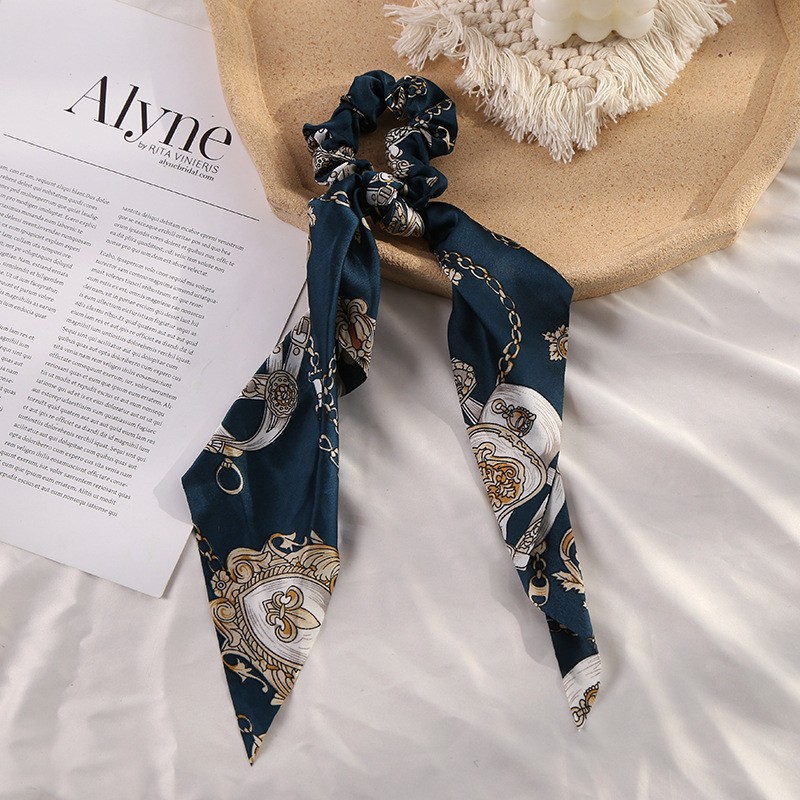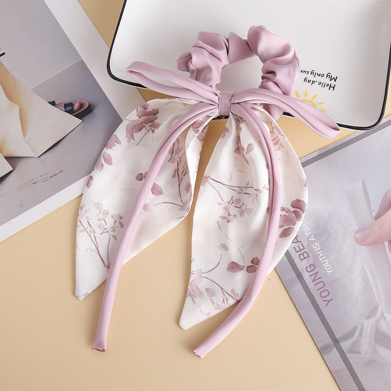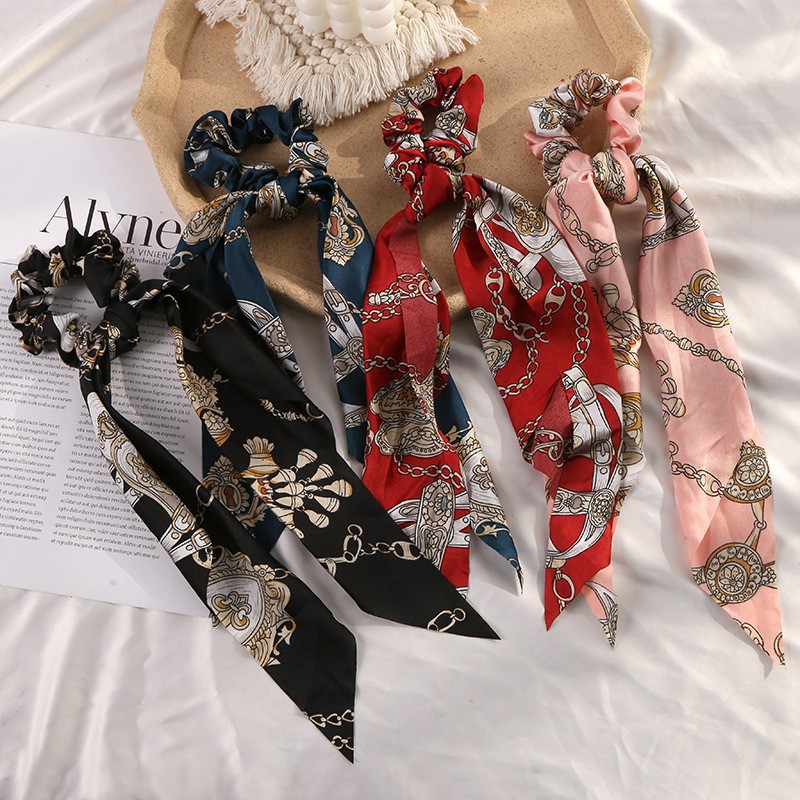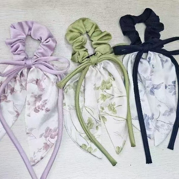 新款高级缎面印花蝴蝶结飘带大肠发圈国风气质中式后脑勺马尾头绳